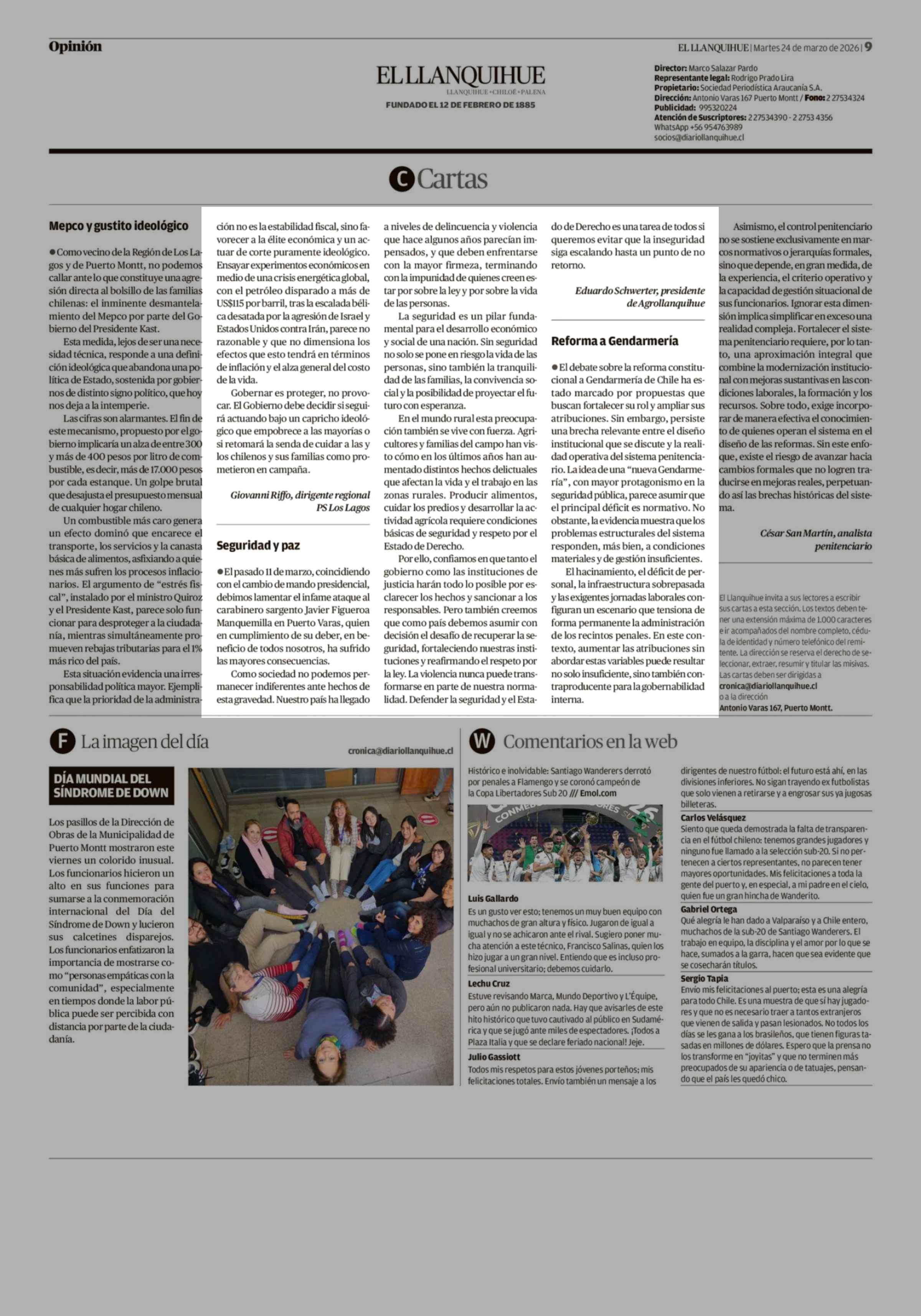 Cartas: Seguridad y paz 24-03-2026 El Llanquihue |