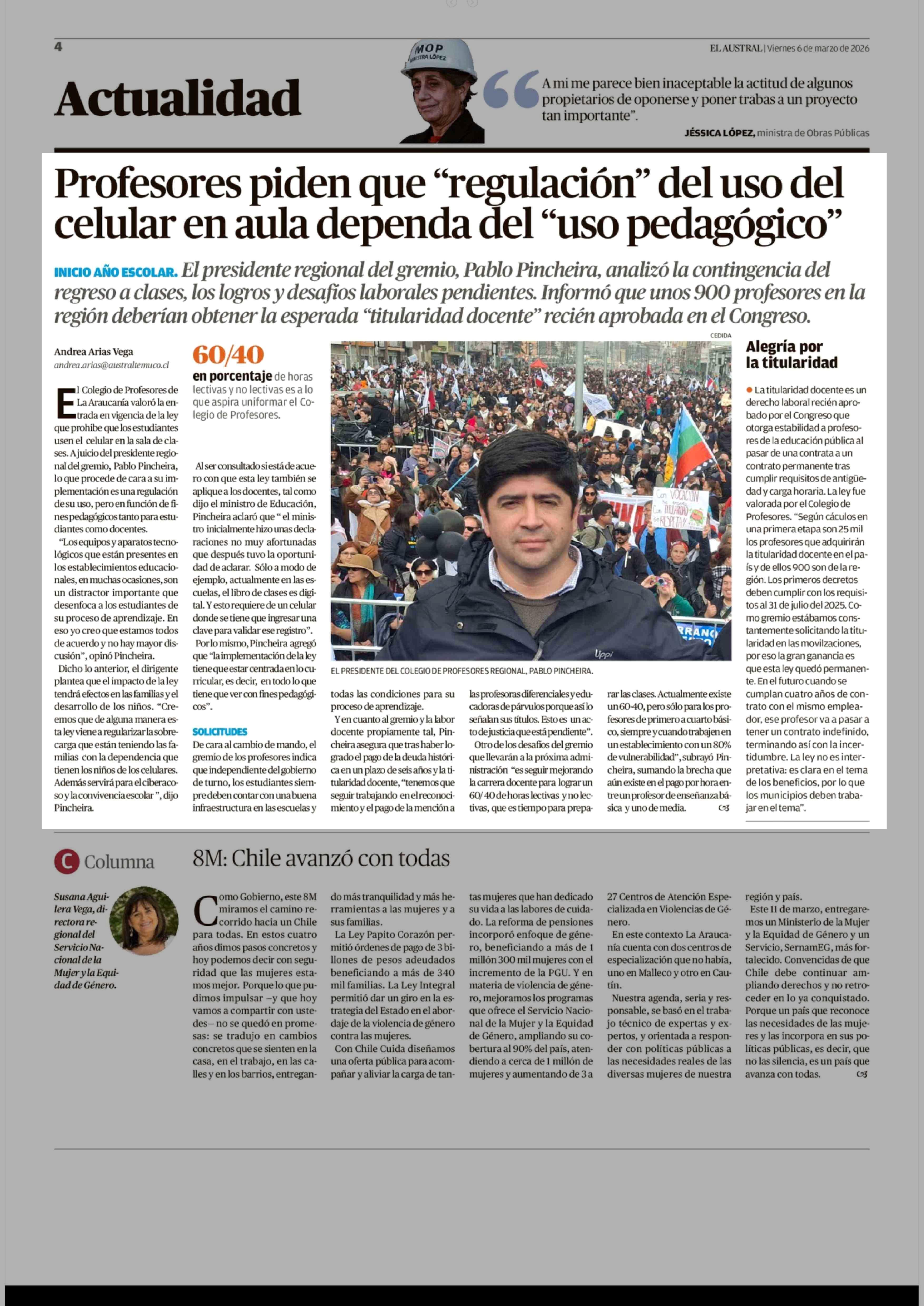 Profesores piden que "regulación" del uso del celular en aula dependa del "uso pedagógico" 06-03-2026 El Austral de la Araucanía |