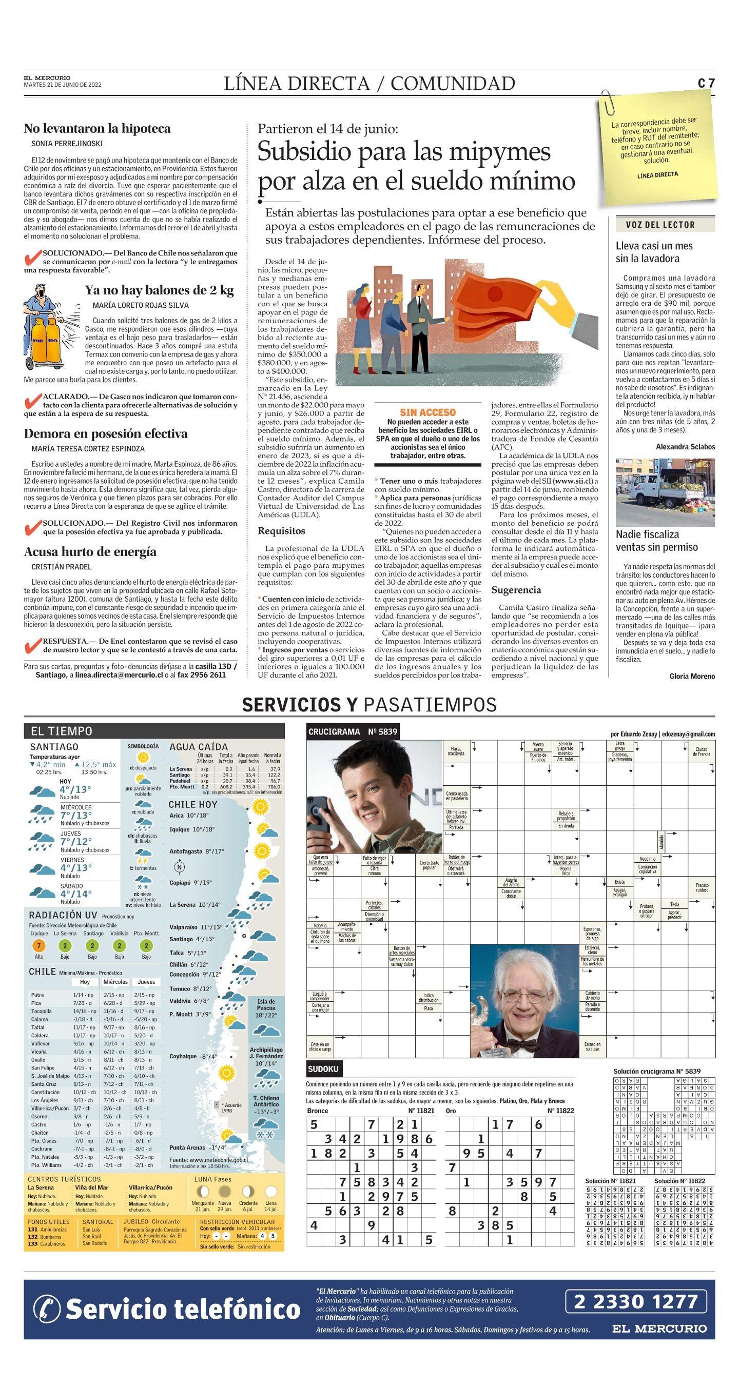 Subsidio para las mipymes por alza en el sueldo mínimo 21-06-2022 El Mercurio |