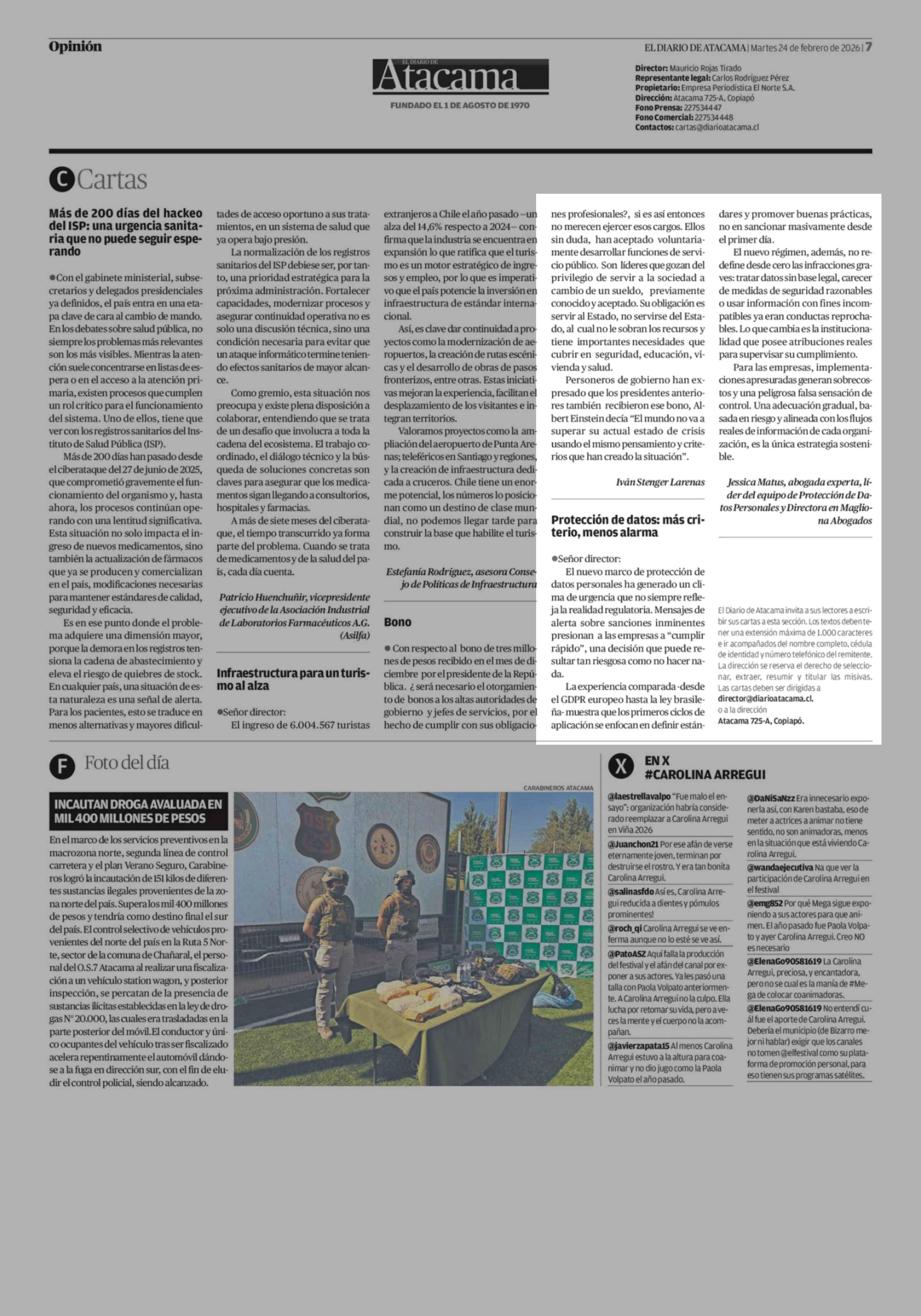 Cartas: Protección de datos: más criterio, menos alarma 24-02-2026 El Diario de Atacama |