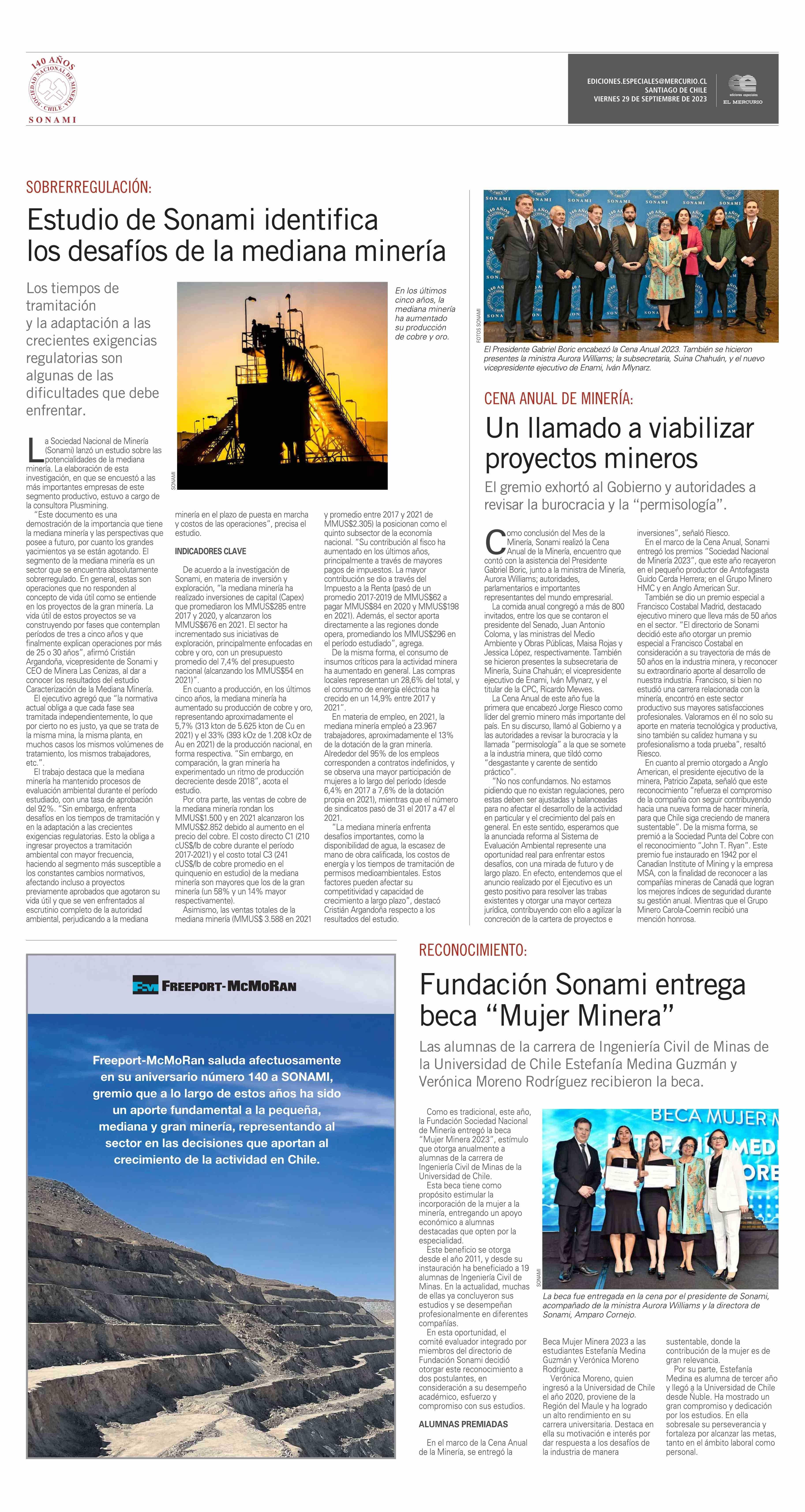 Un llamado a viabilizar proyectos mineros 29-09-2023 El Mercurio |
