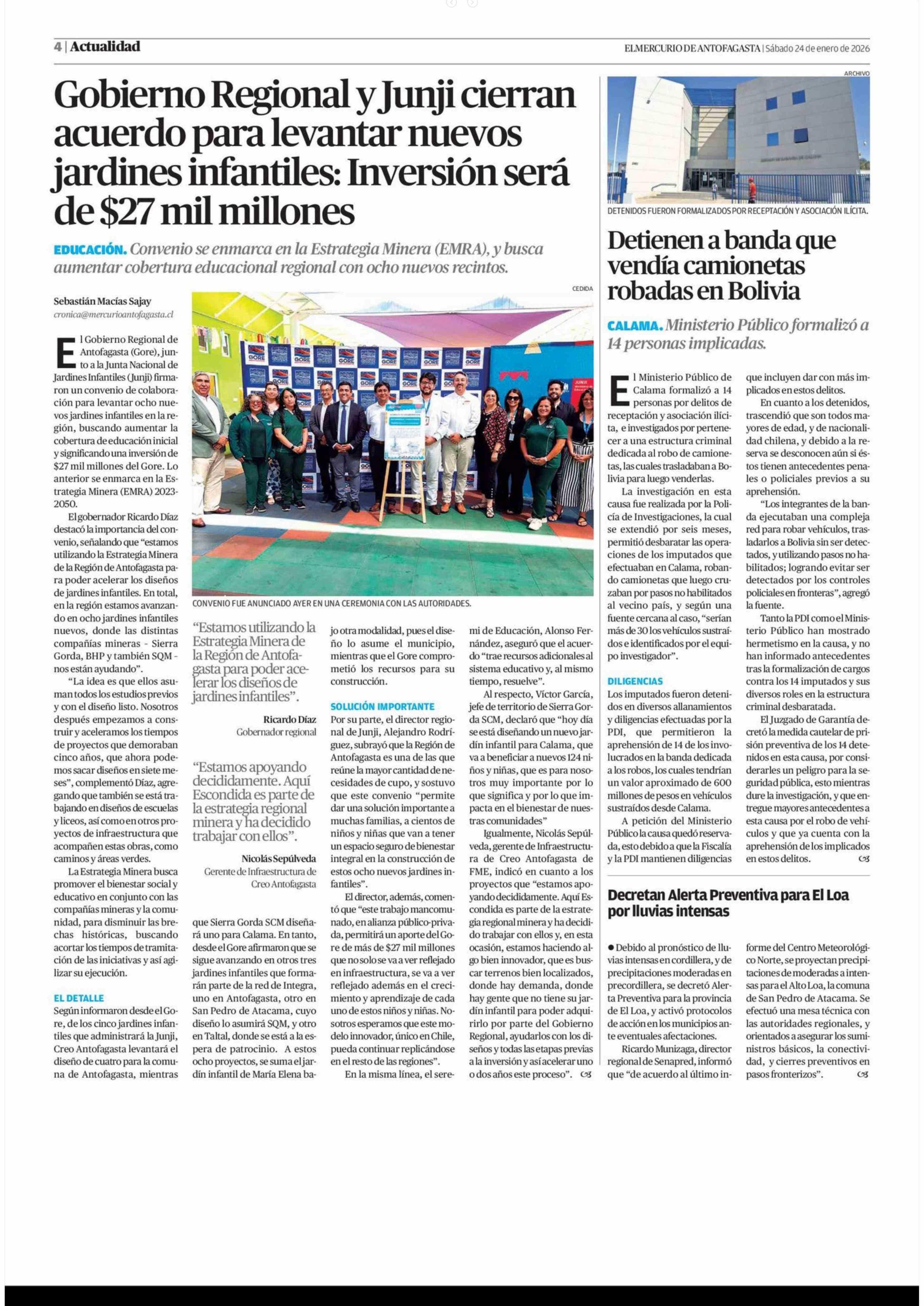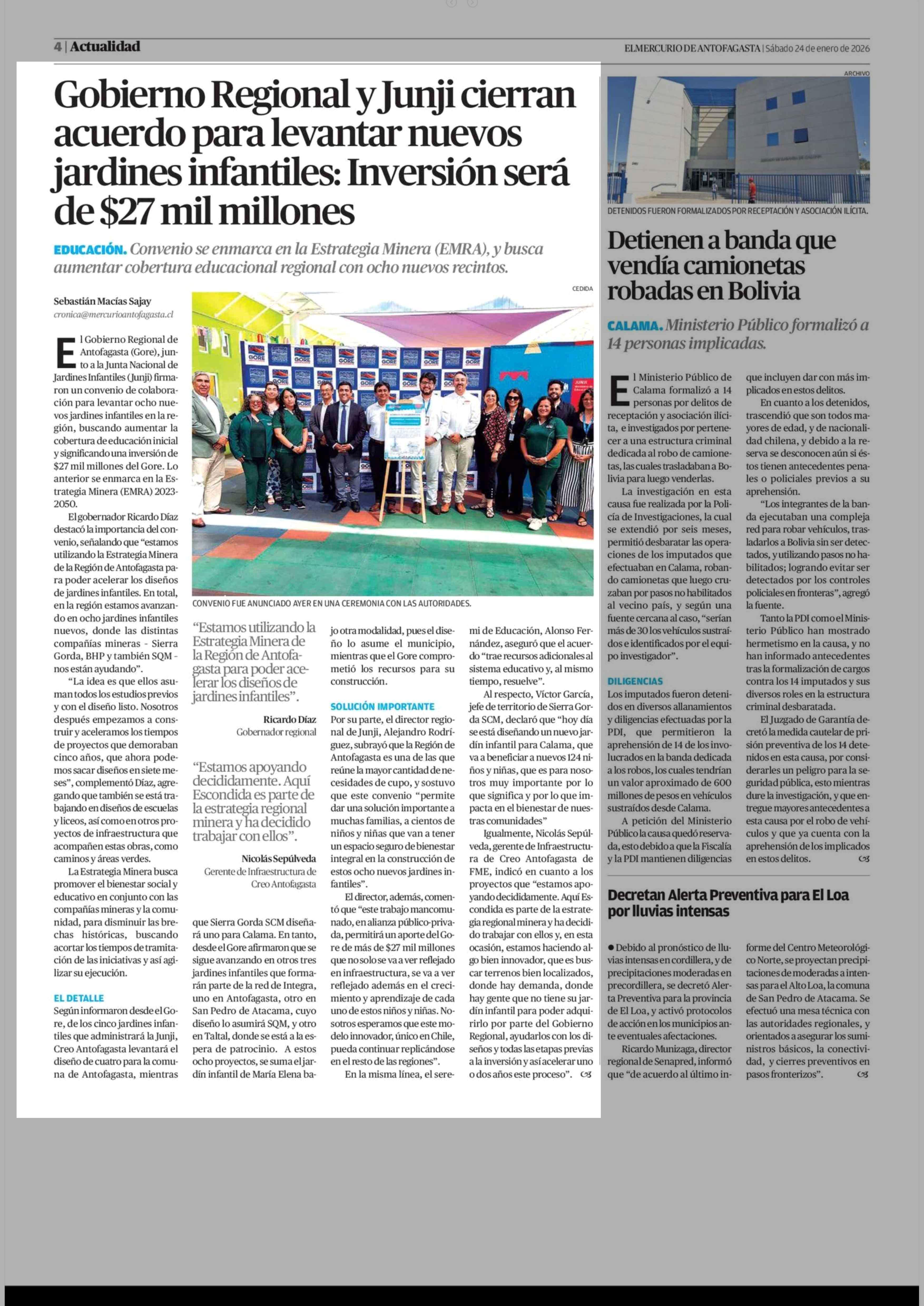 Gobierno Regional y Junji cierran acuerdo para levantar nuevos jardines infantiles: Inversión será de $27 mil millones 24-01-2026 El Mercurio de Antofagasta |