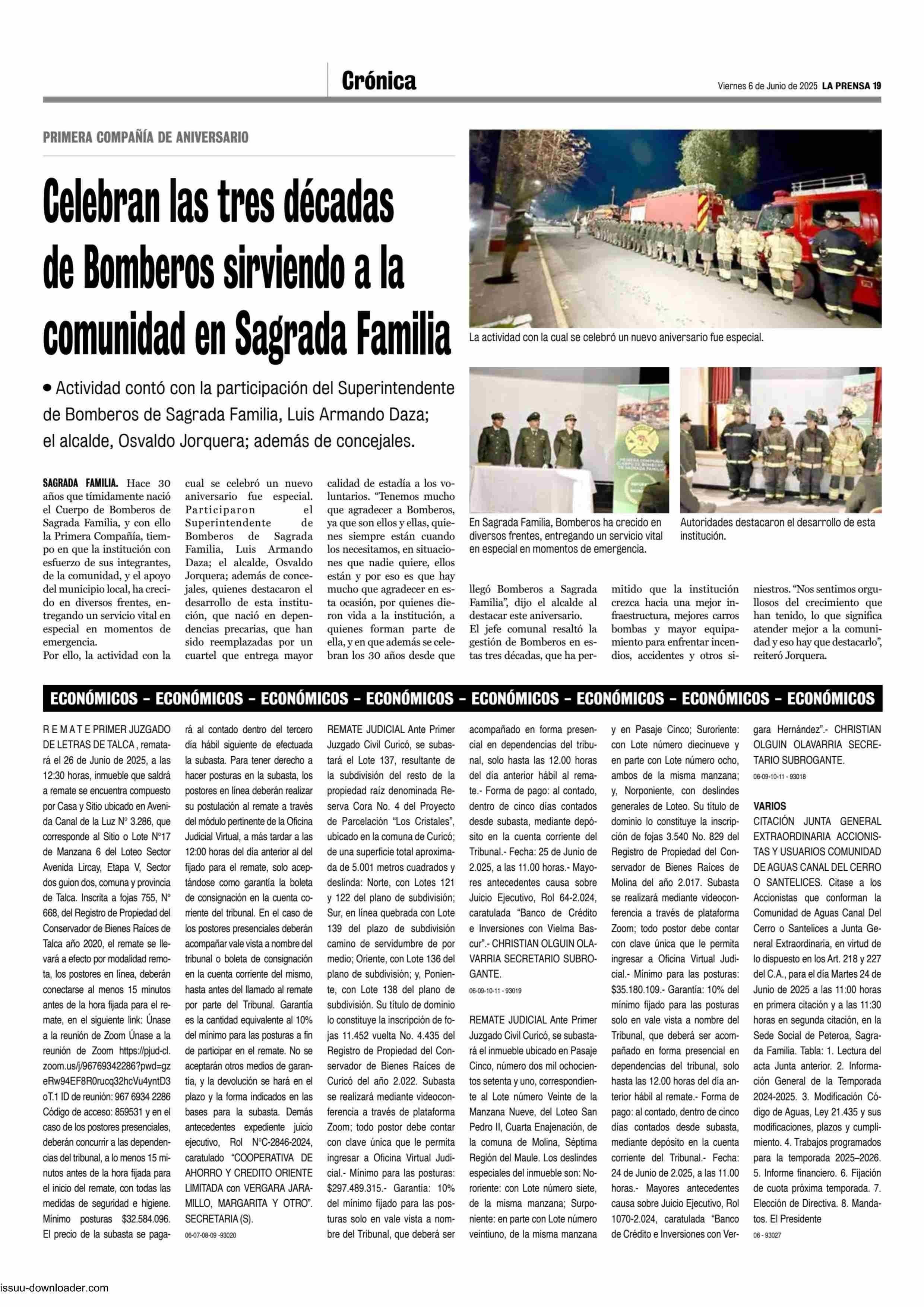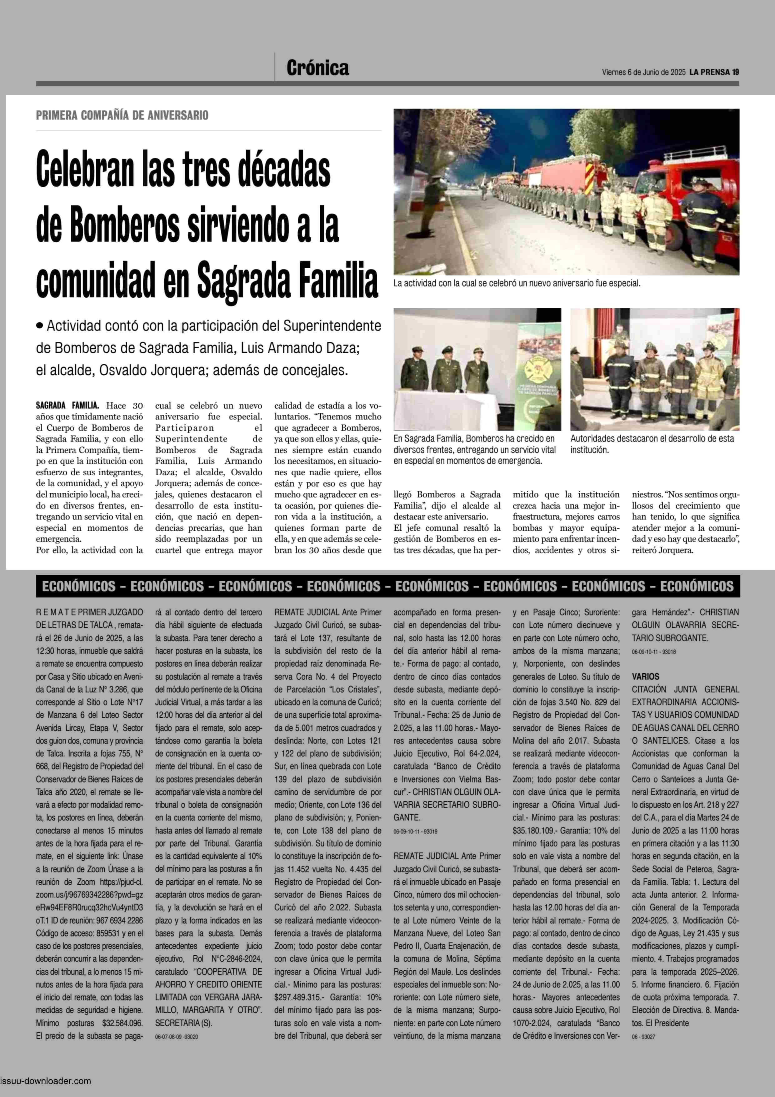 Celebran las tres décadas de Bomberos sirviendo a la comunidad en Sagrada Familia 06-06-2025 La Prensa de Curicó |