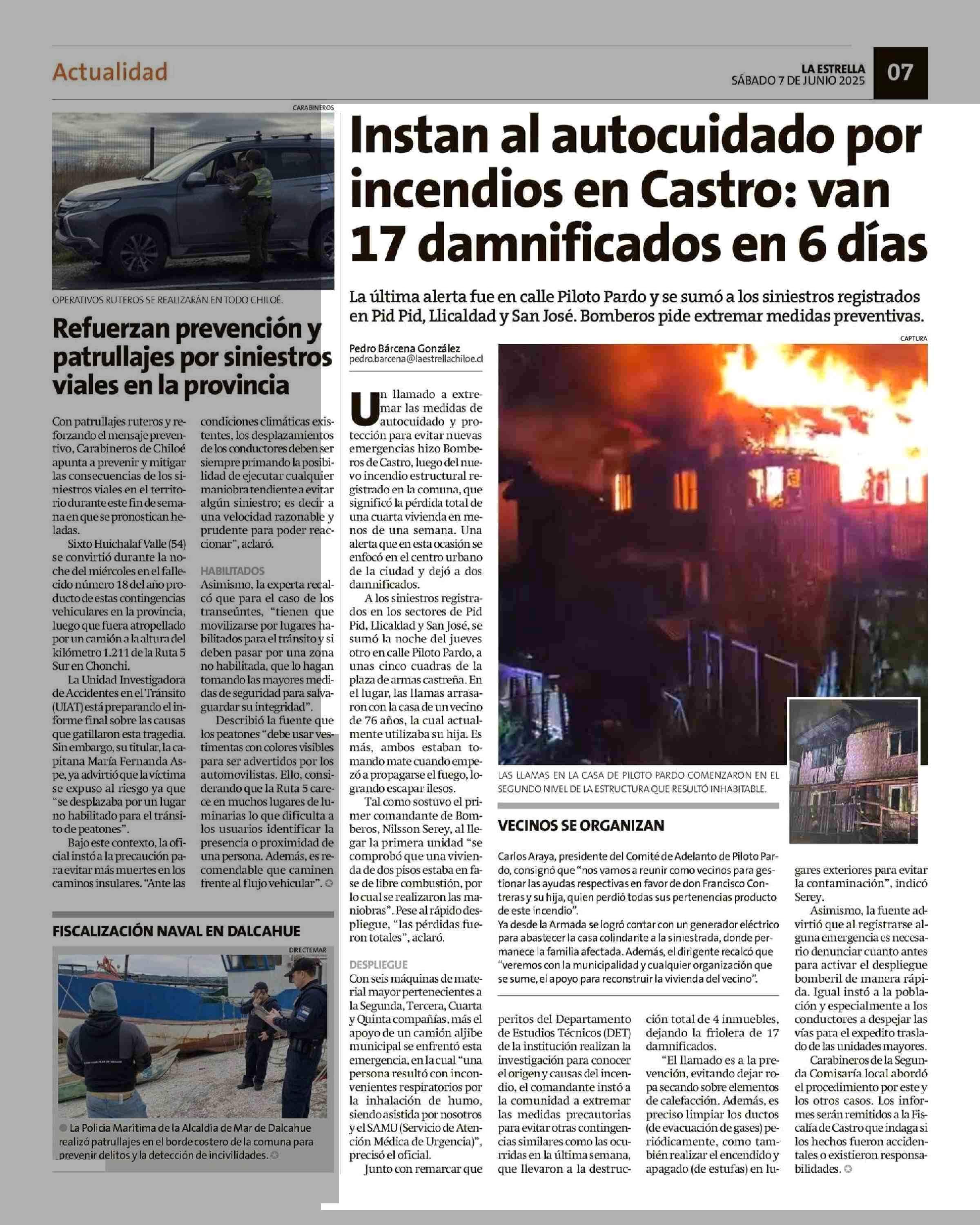 Instan al autocuidado por incendios en Castro van 17 damnificados en 6 días 07-06-2025 La Estrella de Chiloé |