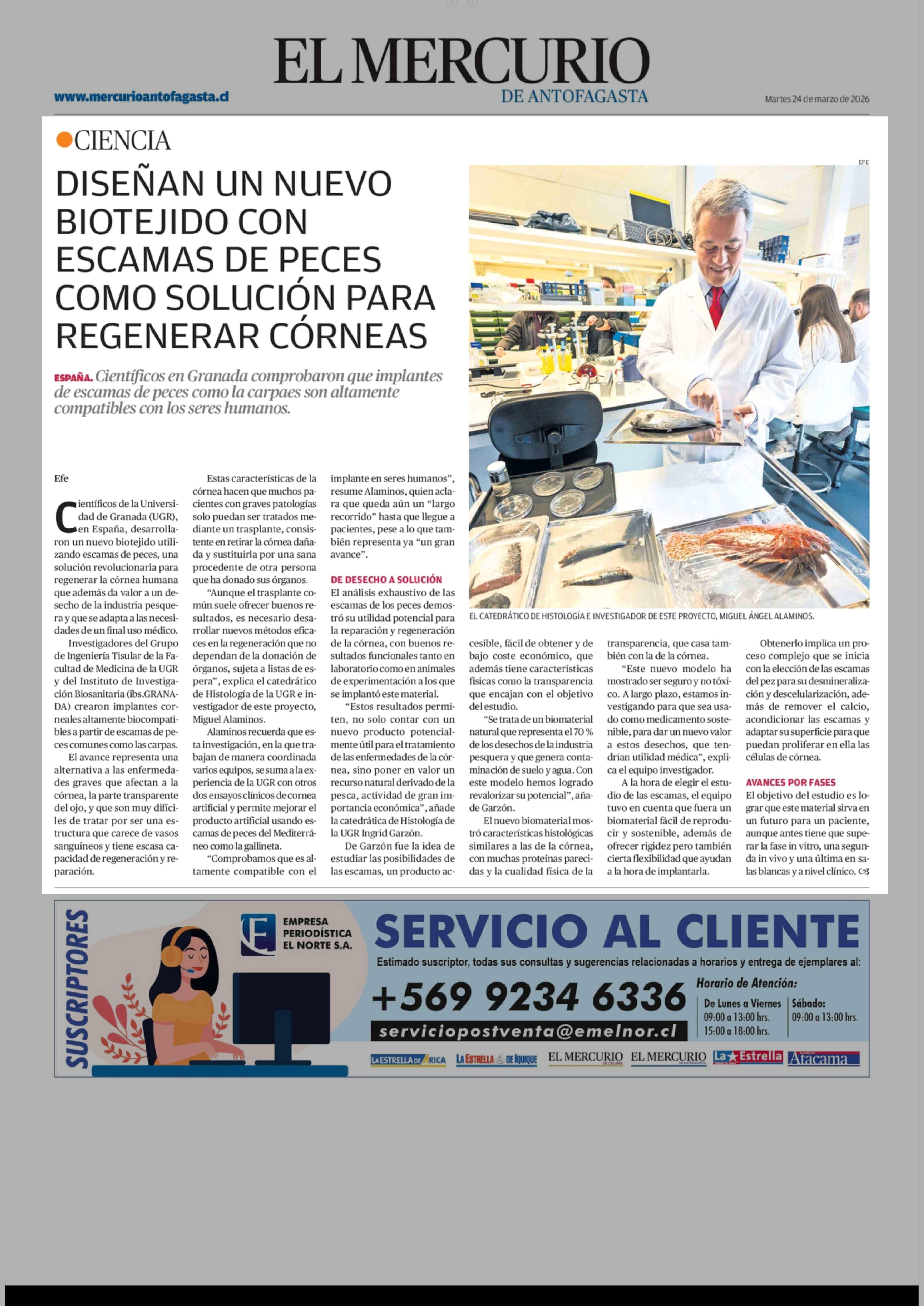 DISEÑAN UN NUEVO BIOTEJIDO CON ESCAMAS DE PECES COMO SOLUCIÓN PARA REGENERAR CÓRNEAS 24-03-2026 El Mercurio de Antofagasta |
