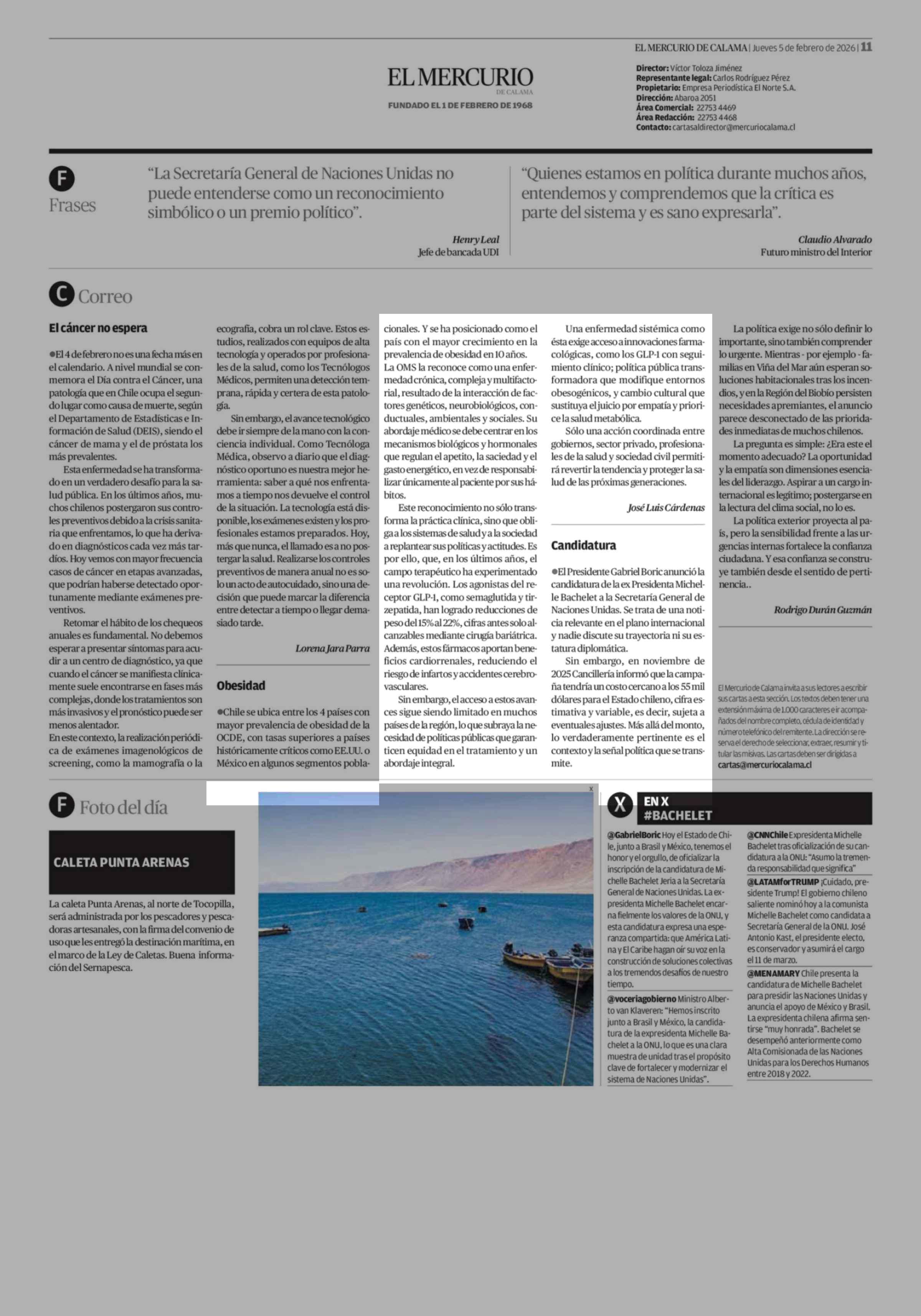 CARTAS: Obesidad 05-02-2026 El Mercurio de Calama |