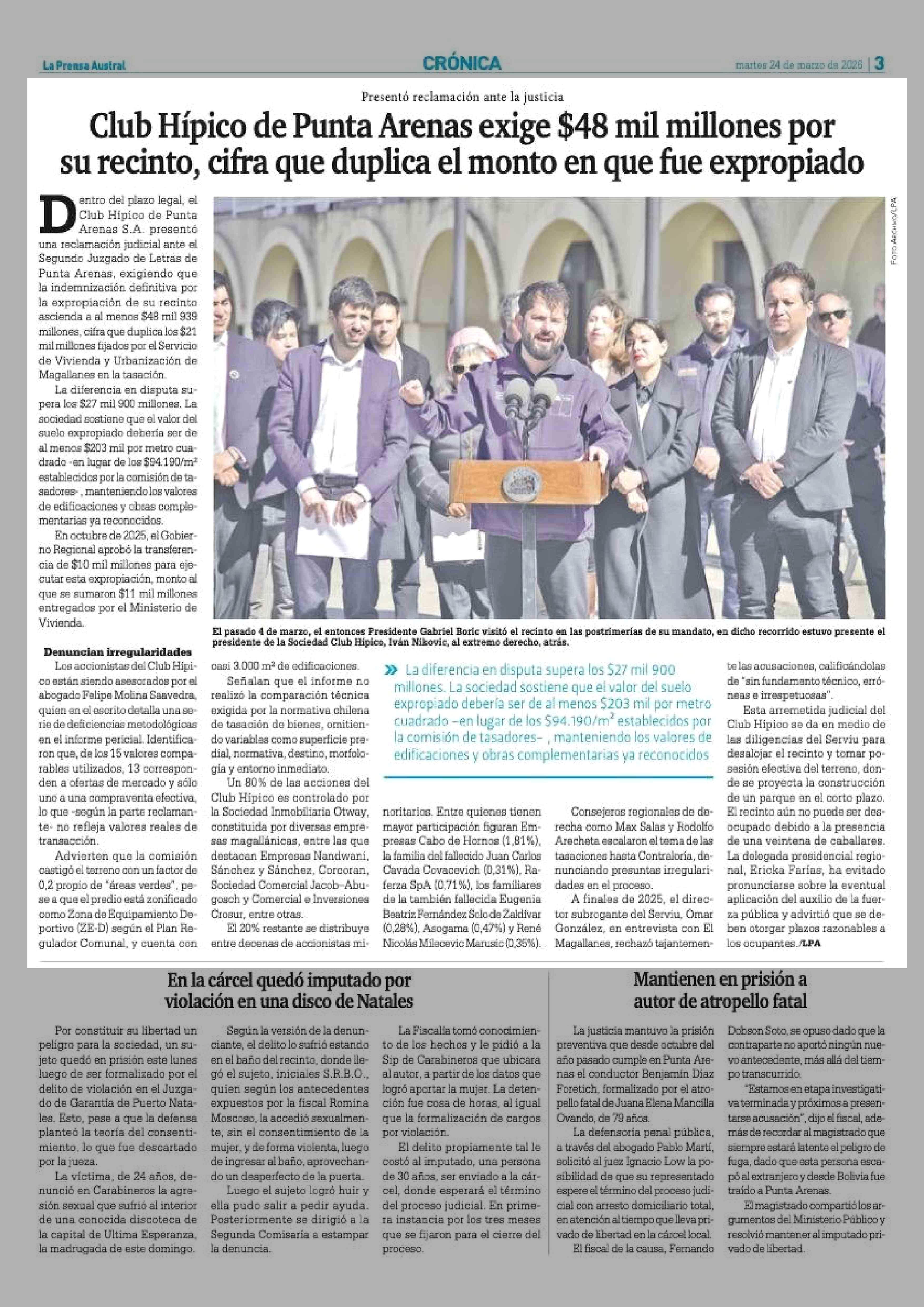 Club Hípico de Punta Arenas exige $48 mil millones por su recinto, cifra que duplica el monto en que fue expropiado 24-03-2026 La Prensa Austral |