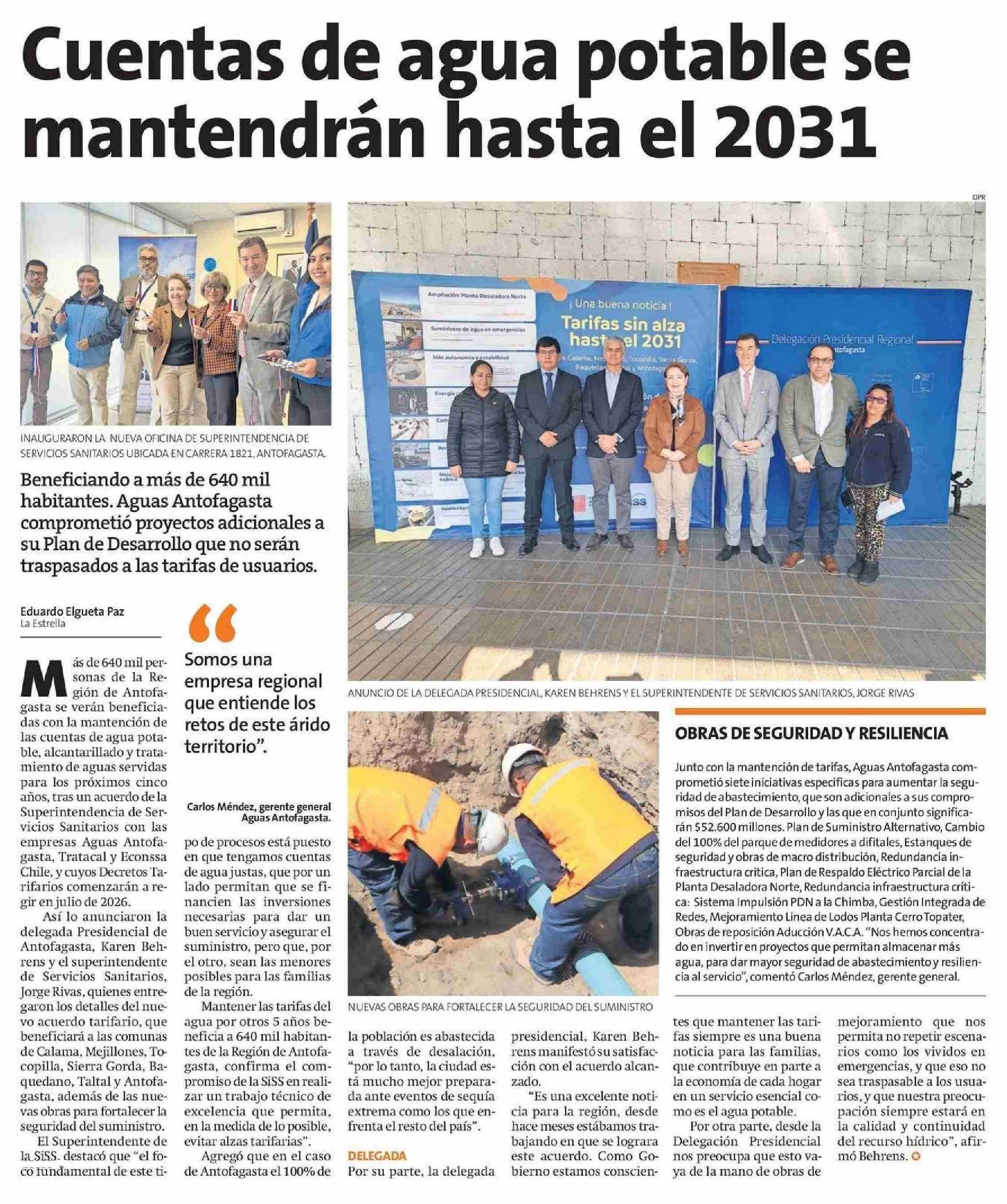 Cuentas de agua potable se mantendrán hasta el 2031 14-06-2025 La Estrella de Antofagasta |
