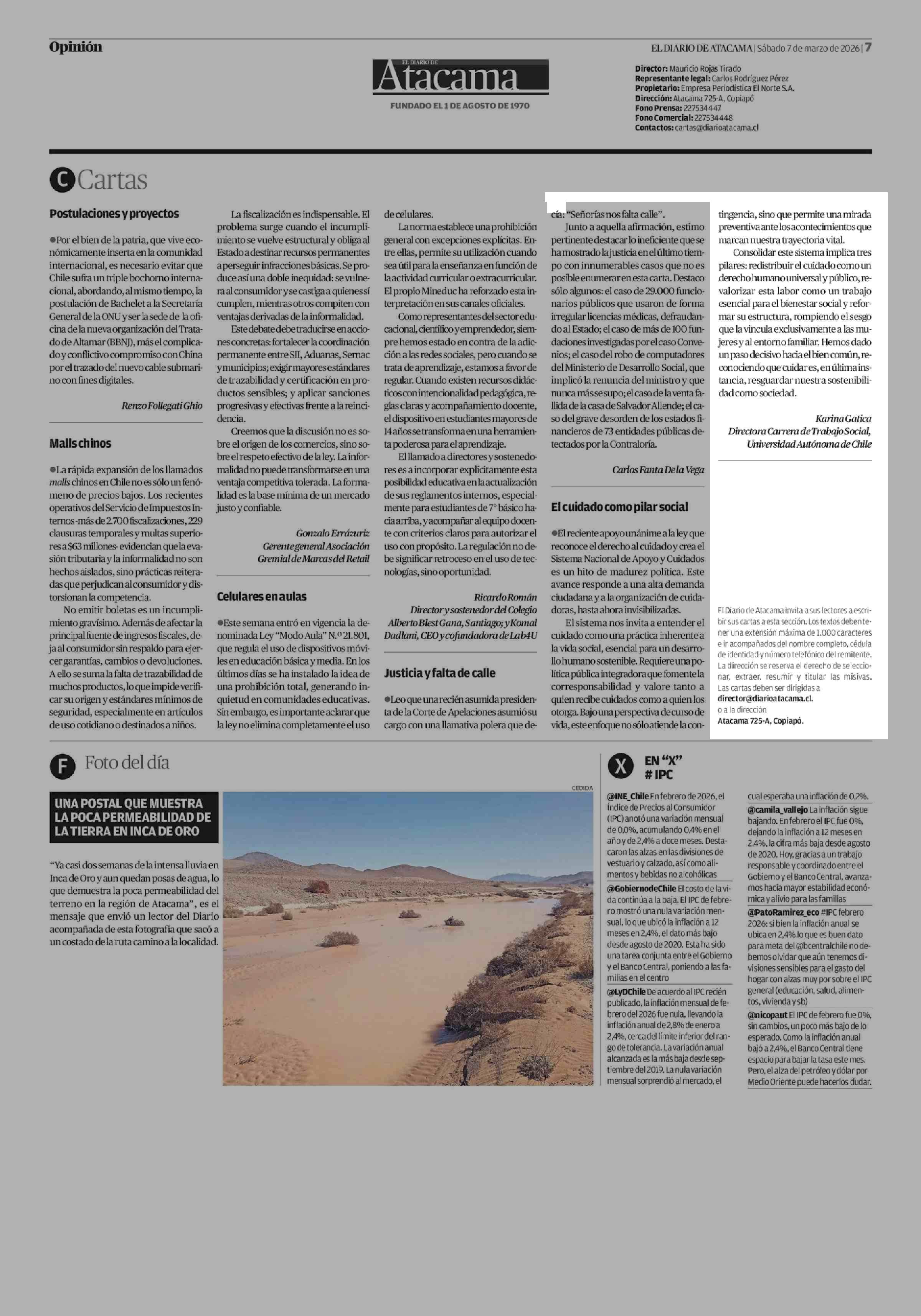 CARTAS: El cuidado como pilar social 07-03-2026 El Diario de Atacama |