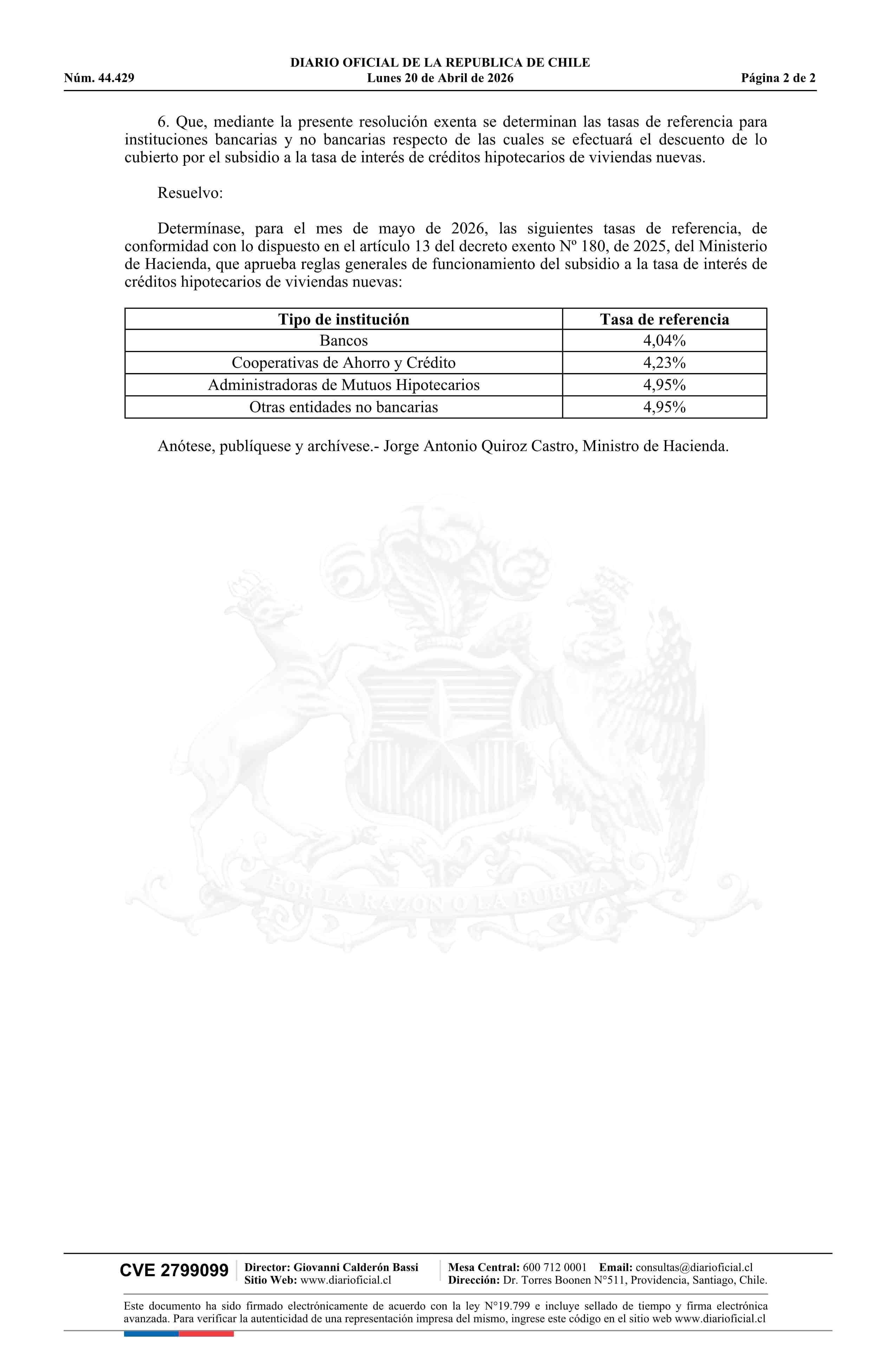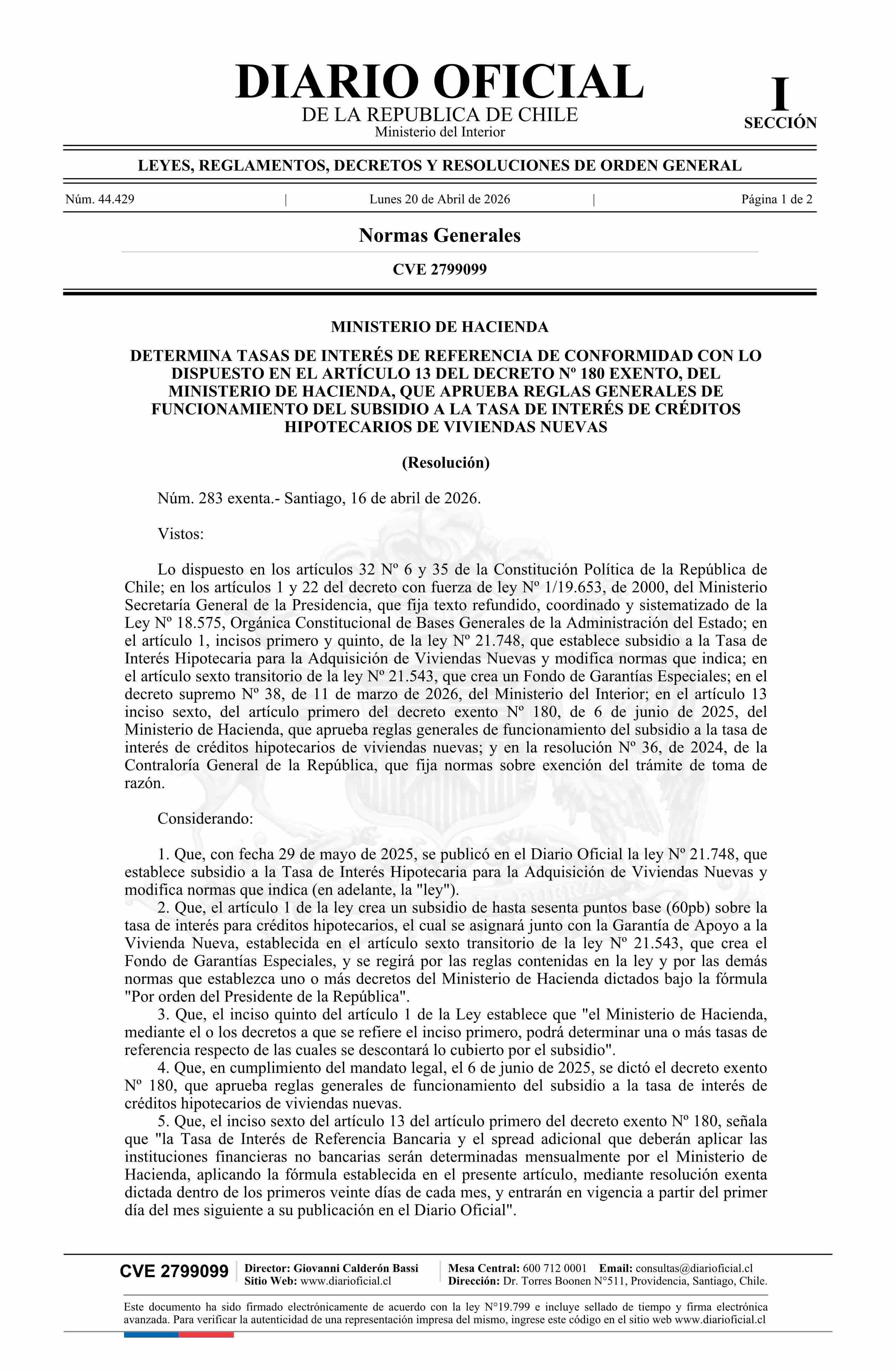 | Título: | Resolución exenta número 283, de 2026.- Determina tasas de interés de referencia de conformidad con lo dispuesto en el artículo 13 del decreto Nº 180 exento, que aprueba reglas generales de funcionamiento del subsidio a la tasa de interés de créditos hipotecarios de viviendas nuevas |