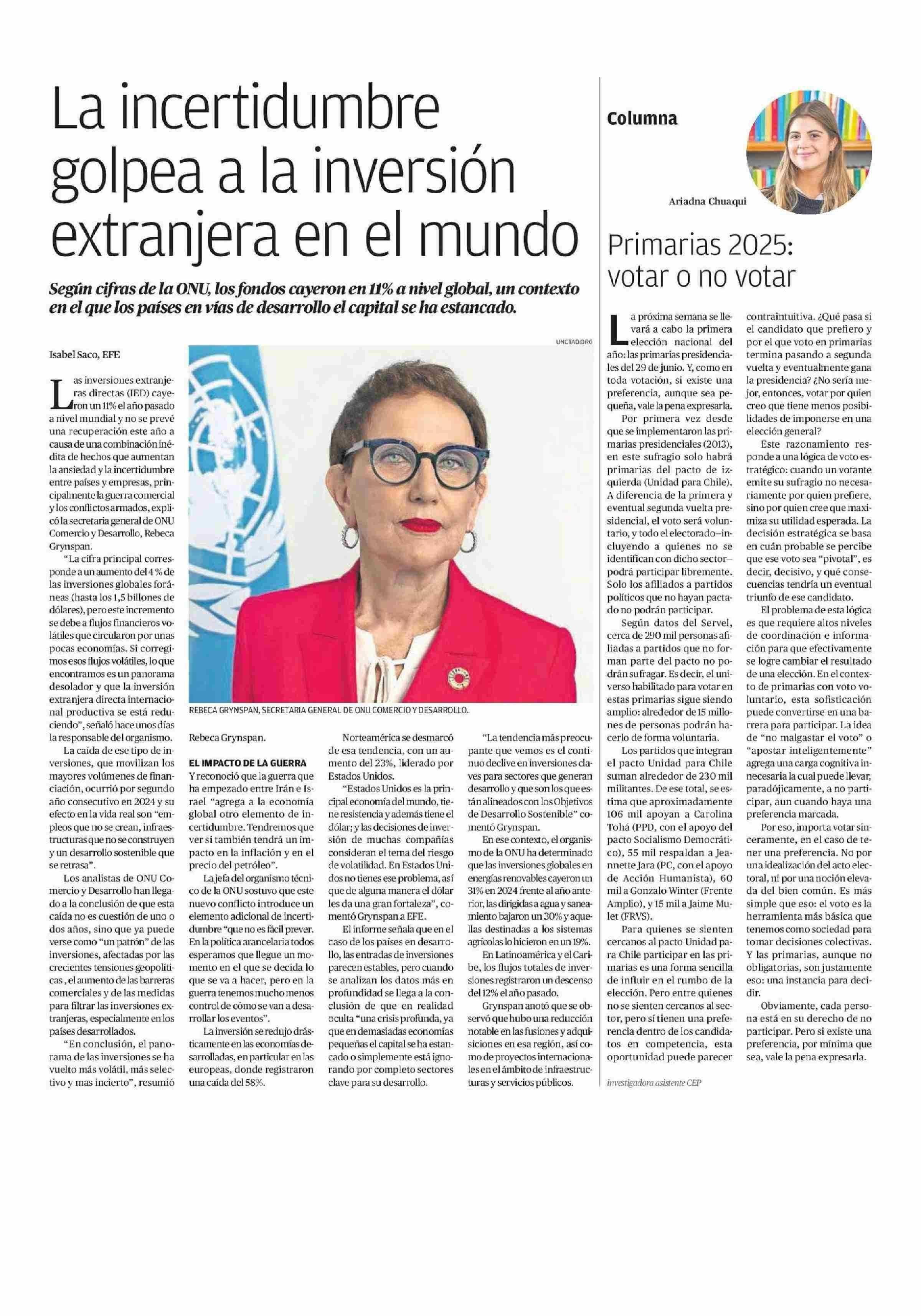 La incertidumbre eolpea a la inversión extranjera en el mundc 22-06-2025 El Mercurio de Antofagasta |