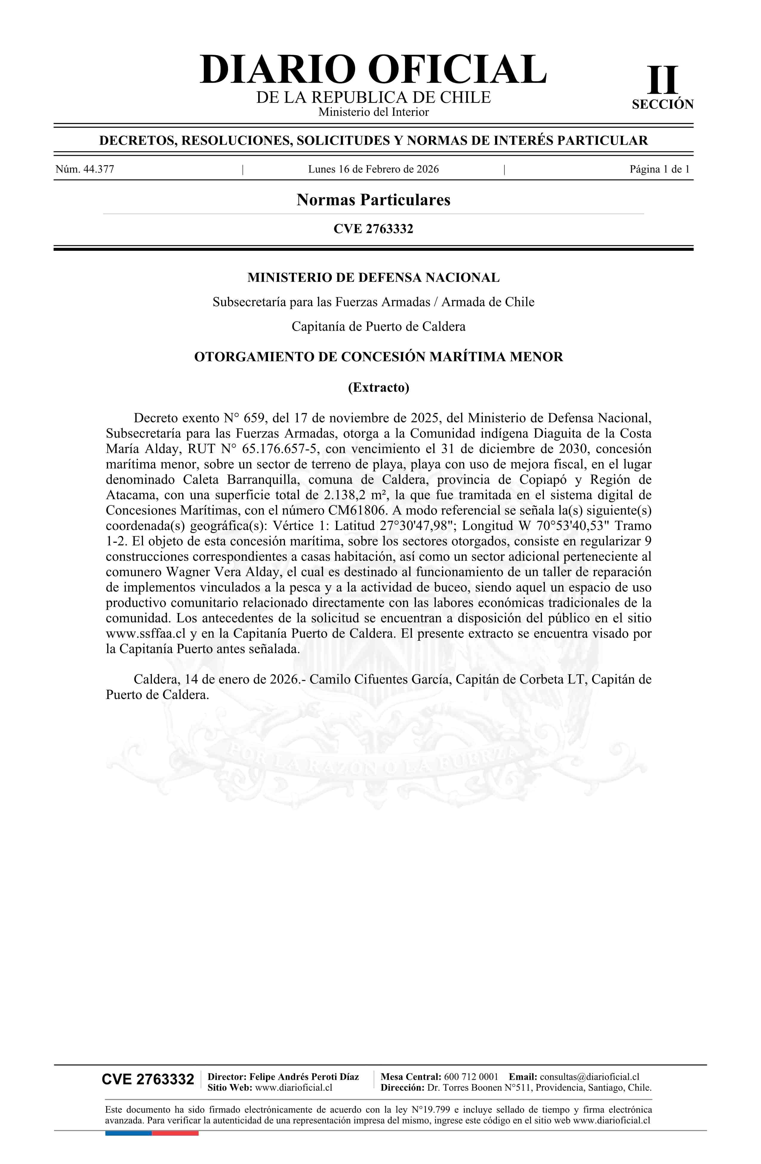 Extracto de decreto exento número 659, de 2025.- Otorgamiento de concesión marítima menor 16-02-2026 Diario Oficial Edición Electrónica |