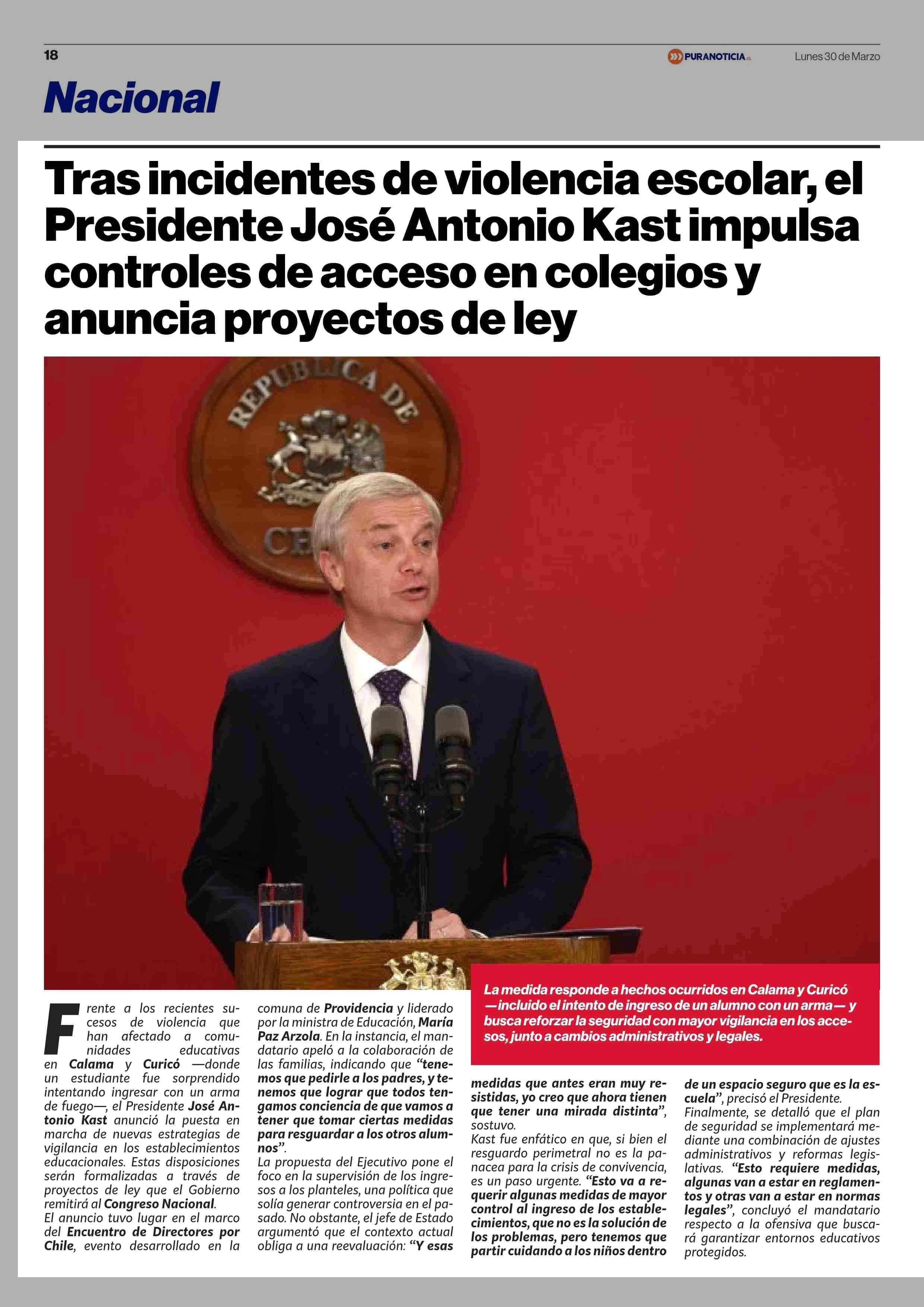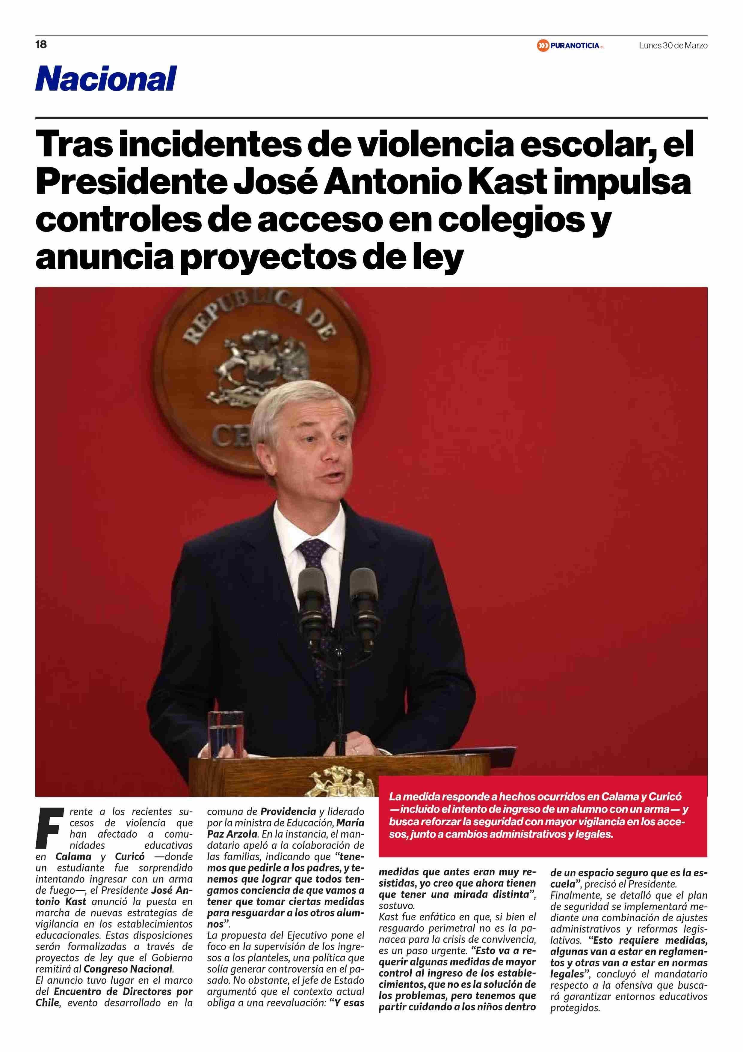 Título: Tras incidentes de violencia escolar, el Presidente José Antonio Kast impulsa controles de acceso en colegios y anuncia proyectos de ley