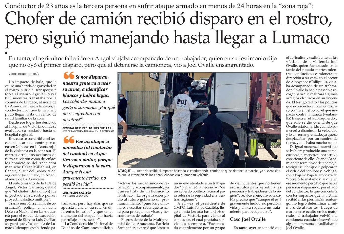 Chofer de camión recibió disparo en el rostro, pero siguió manejando hasta llegar a Lumaco 20-01-2022 El Mercurio |
