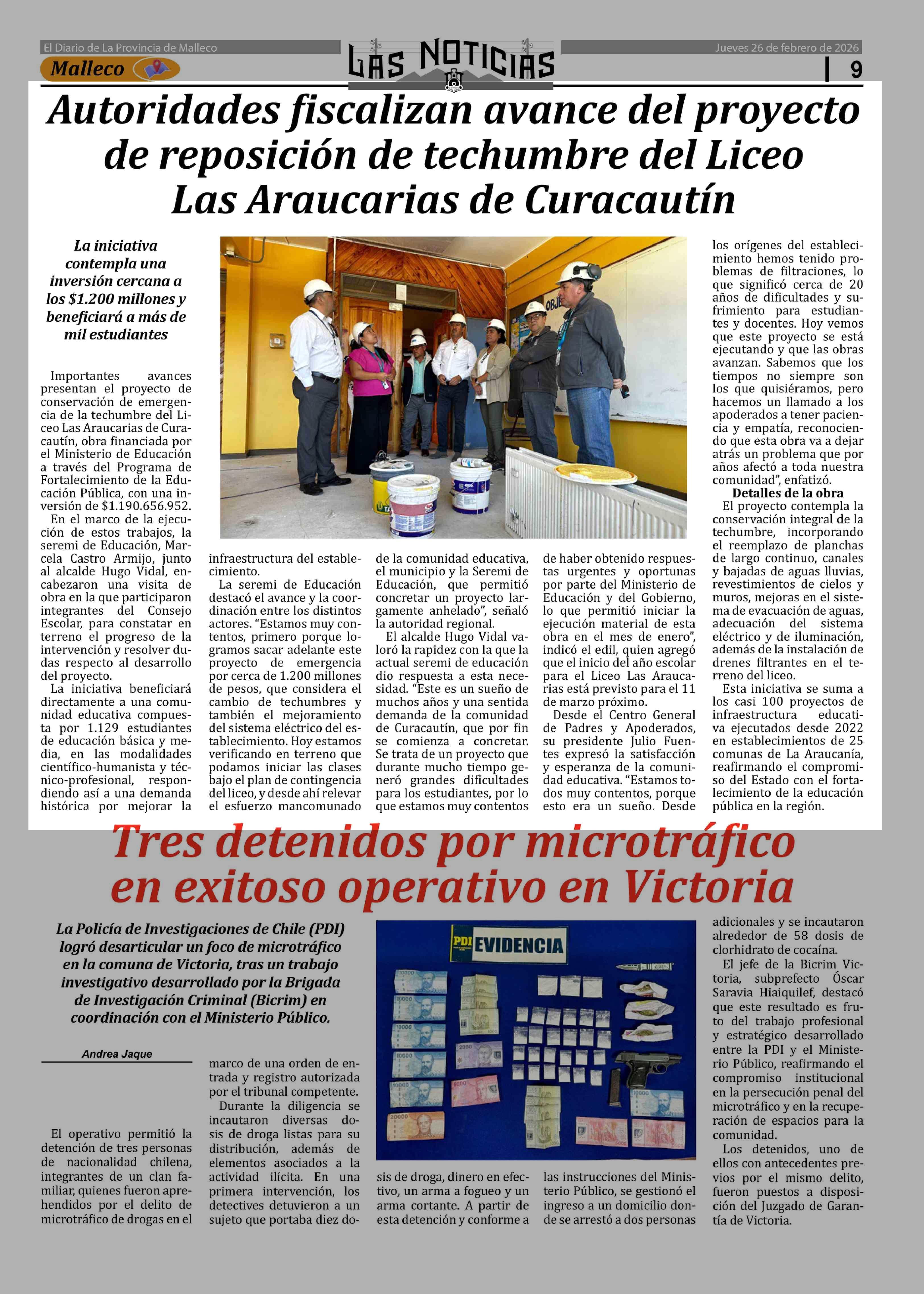 Autoridades fiscalizan avance del proyecto de reposición de techumbre del Liceo Las Araucarias de Curacautín 26-02-2026 Las Noticias |
