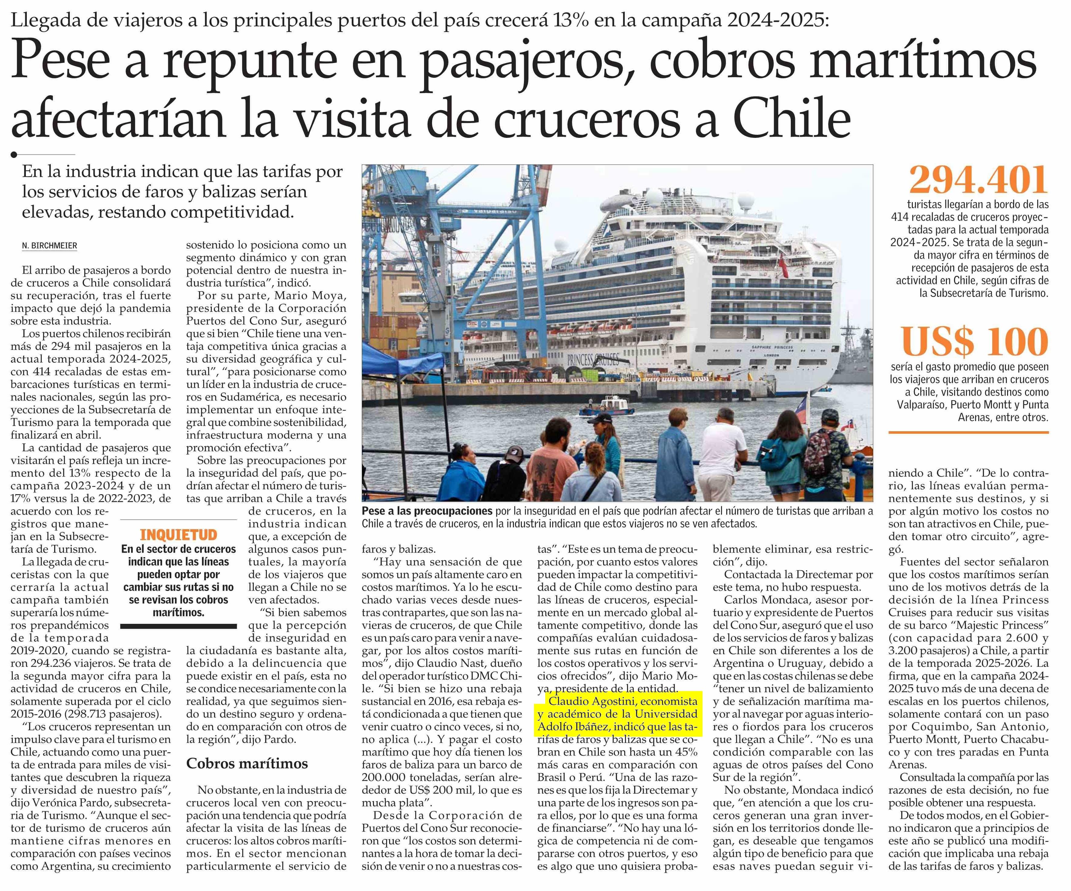 Título: Pese a repunte en pasajeros, cobros marítimos afectarían la visita de cruceros a Chile
