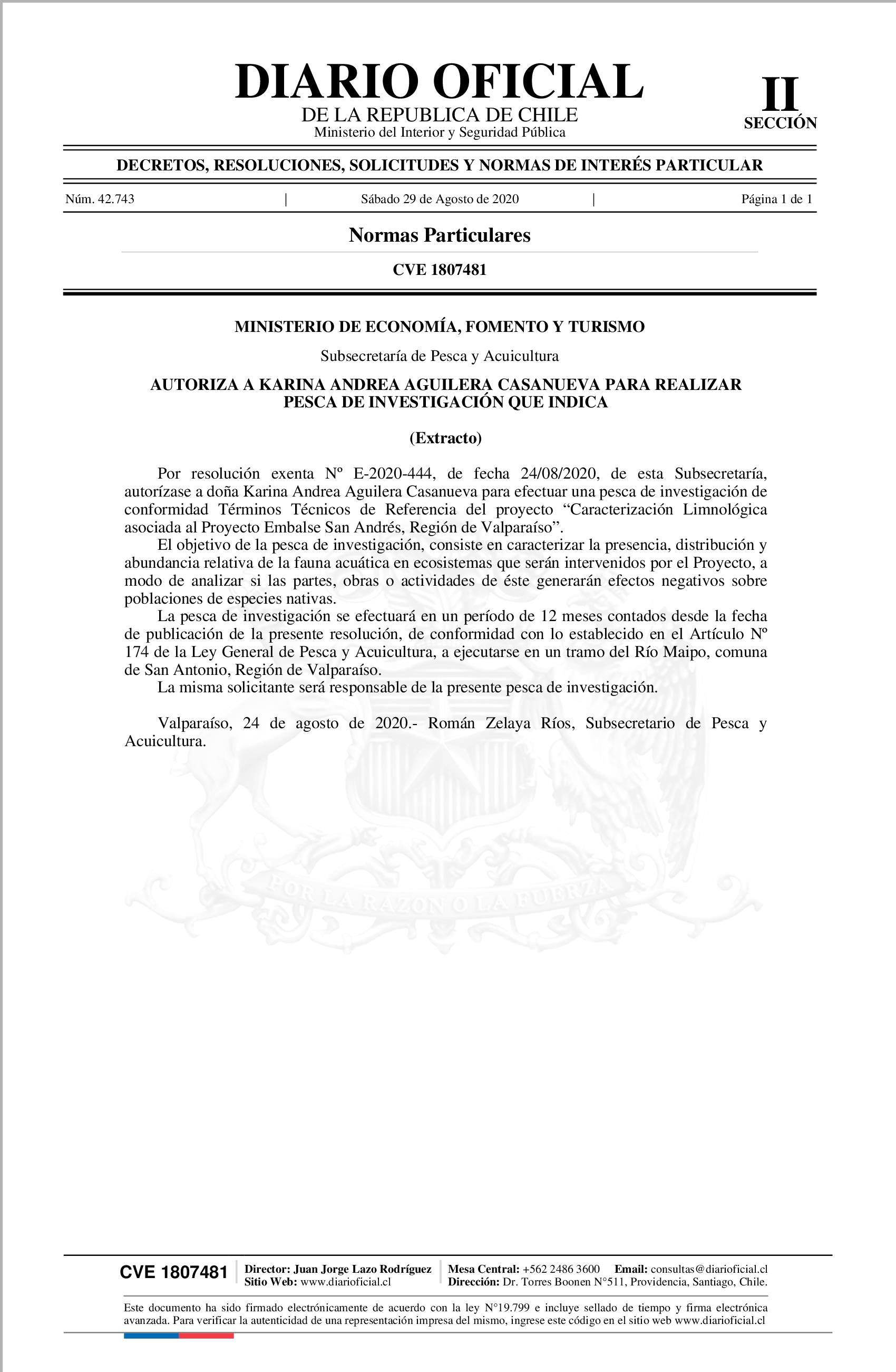 Ministerio de Economía, Fomento Y Turismo Autoriza A Karina Andrea Aguilera Casanueva Para Realizar Pesca de Investigación Que Indica (Extracto) 29-08-2020 Diario Oficial Edición Electrónica |