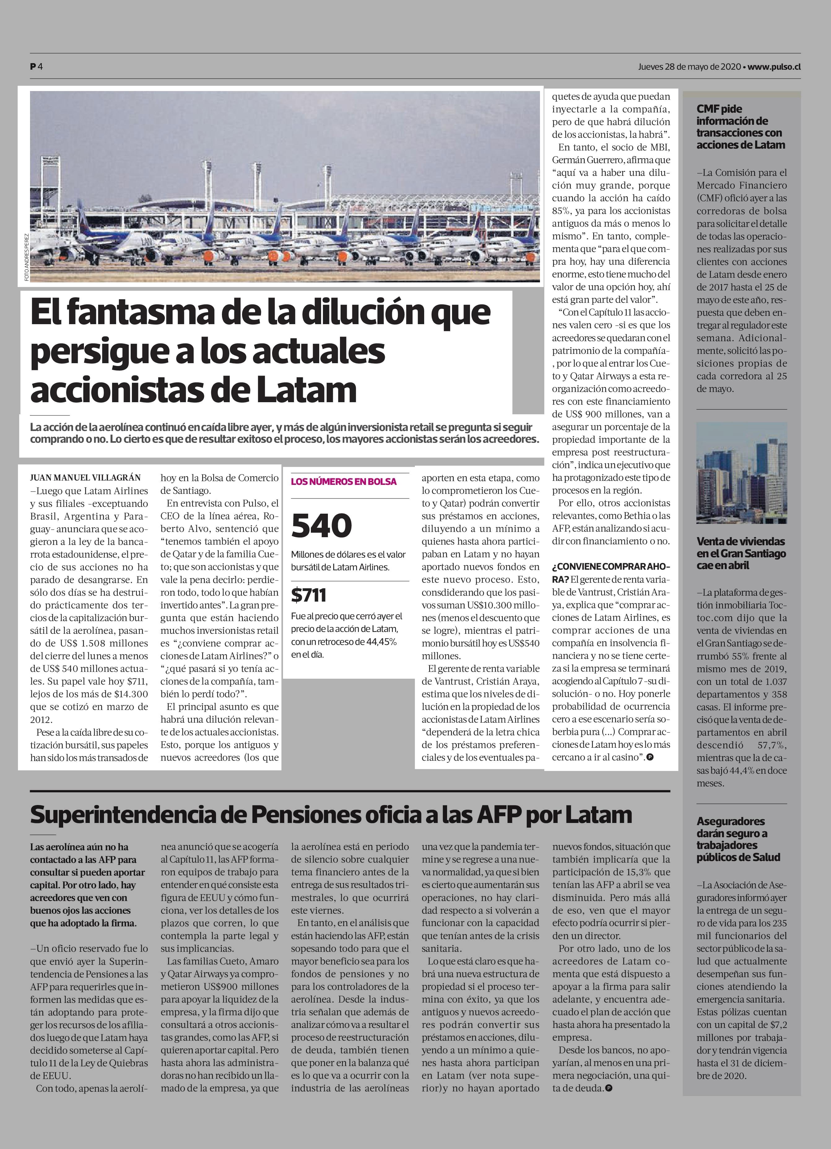 El fantasma de la dilución que persigue a los actuales accionistas de Latam 28-05-2020 La Tercera |