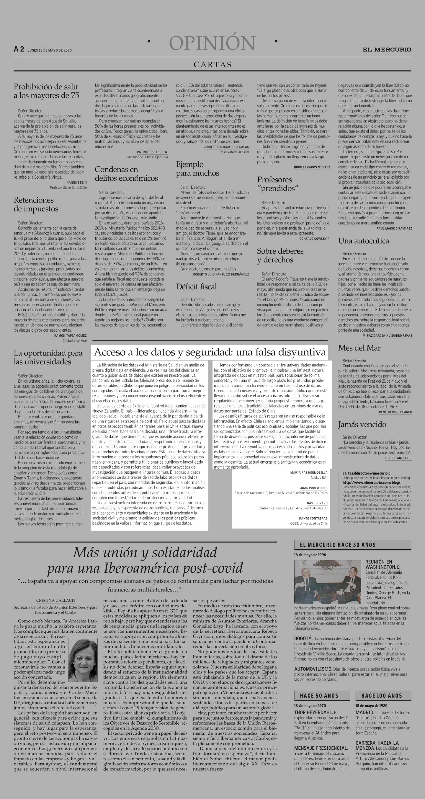 Acceso a los datos y seguridad: una falsa disyuntiva 18-05-2020 El Mercurio |