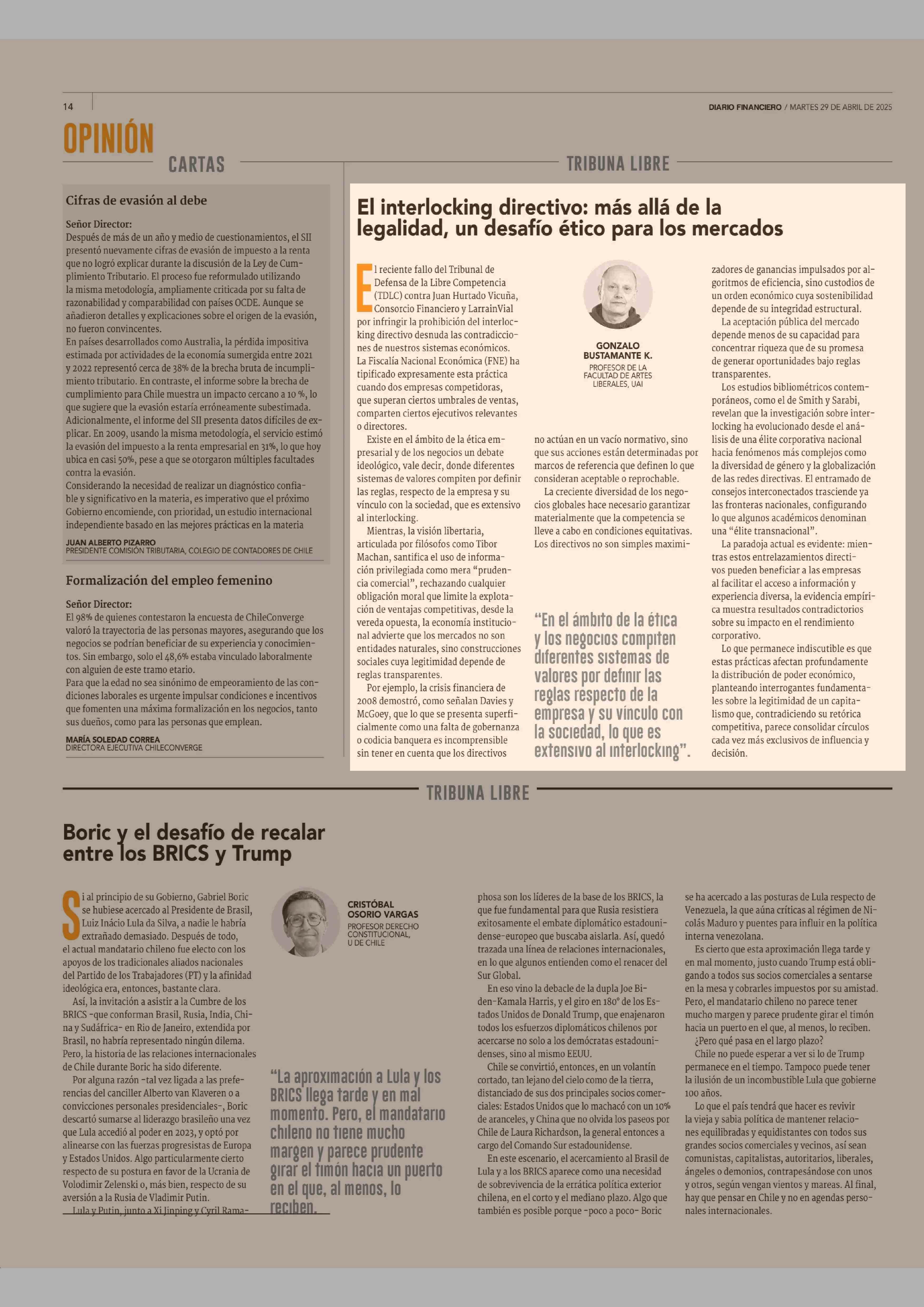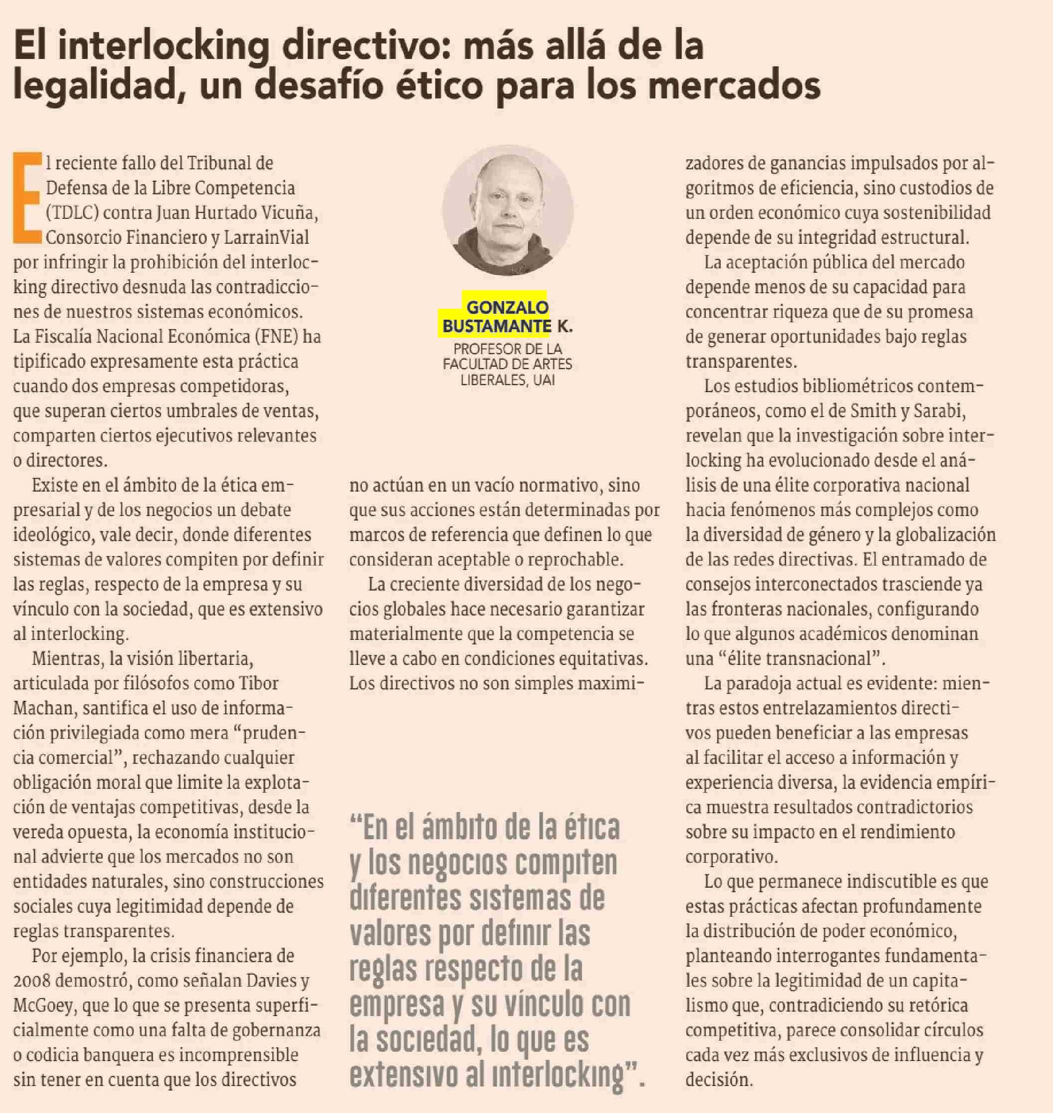 COLUMNAS DE OPINIÓN: El interlocking directivo: más allá de la legalidad, un desafío ético para los mercados 29-04-2025 Diario Financiero |