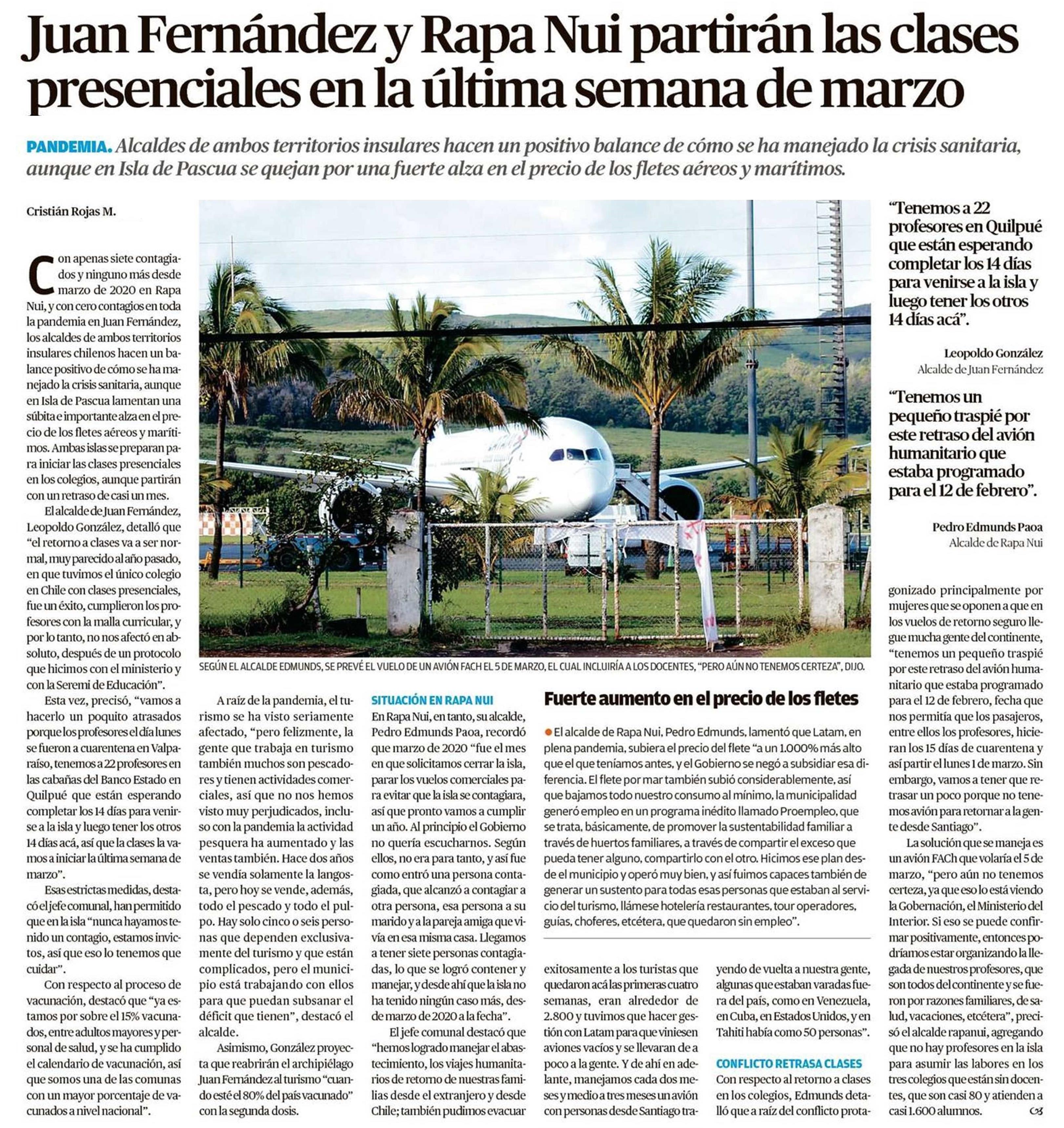 Juan Fernández y Rapa Nui partirán las clases presenciales en la última semana de marzo 01-03-2021 El Mercurio de Valparaíso |