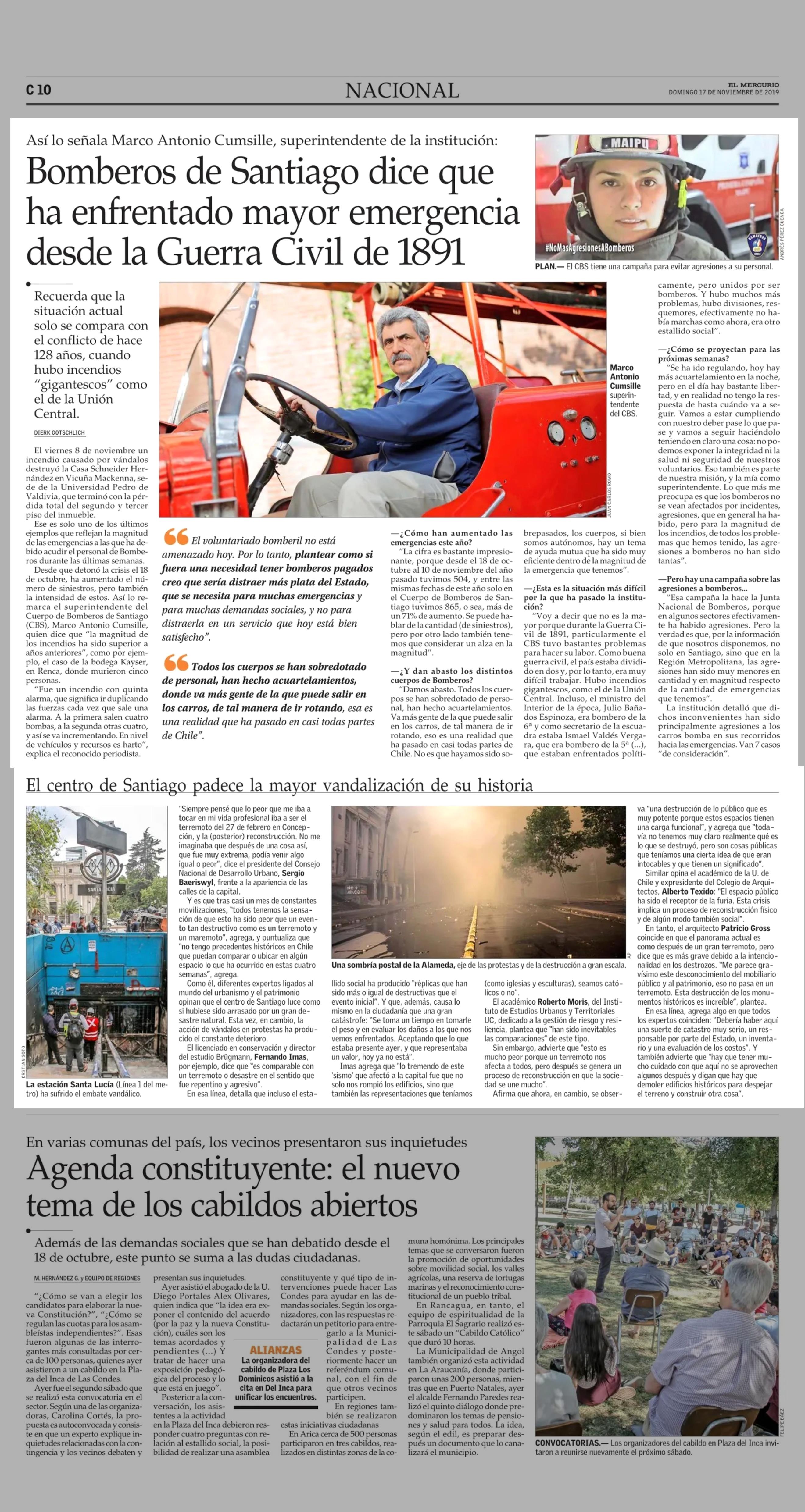 Bomberos de Santiago dice que ha enfrentado mayor emergencia desde la Guerra Civil de 1891 17-11-2019 El Mercurio |