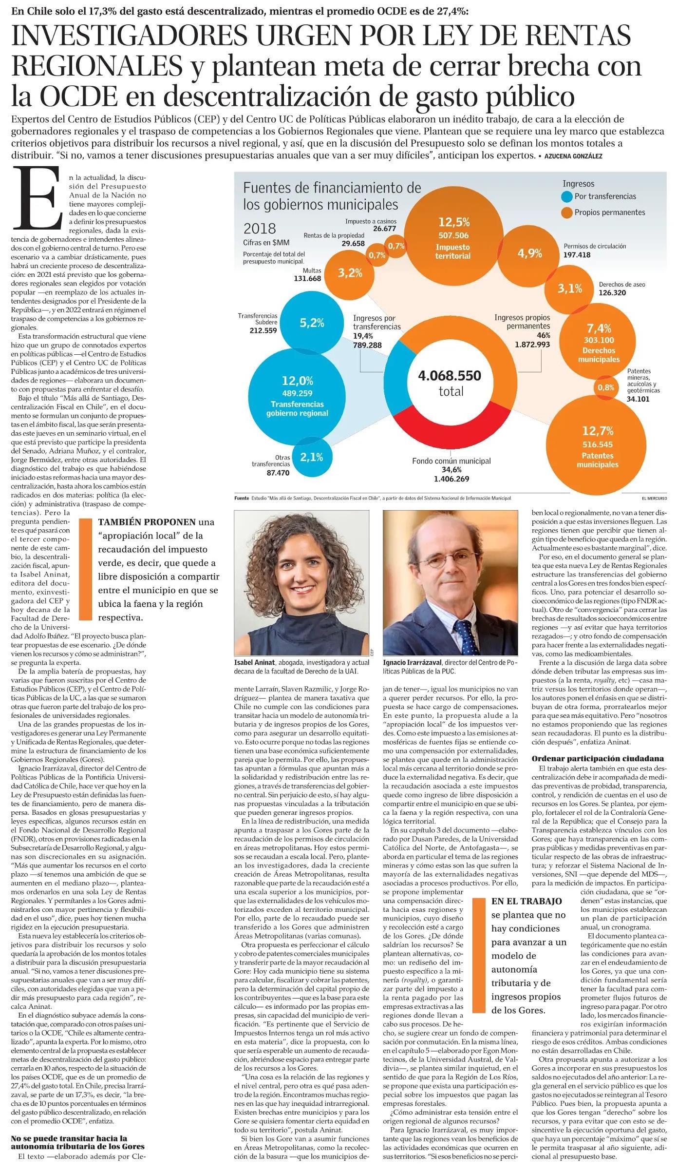 Bajo el título “Más allá de Santiago, Descentralización Fiscal en Chile”, en el documento se formulan un conjunto de propuestas en el ámbito fiscal, las que serán presentadas este jueves en un seminario virtual, en el que está previsto que participe la presidenta del Senado, Adriana Muñoz, y el contralor, Jorge Bermúdez, entre otras autoridades.
