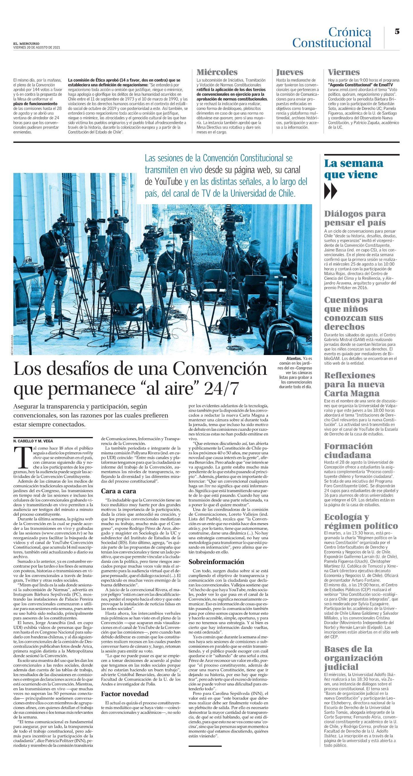 Además de las cámaras de los medios de comunicación tradicionales apostadas en los jardines del ex-Congreso, las transmisiones en tiempo real de las sesiones e incluso los celulares de los convencionales grabando videos y transmitiendo en vivo permiten a la audiencia ser testigos del minuto a minuto del proceso constituyente. Durante la última semana, la página web de la Convención en la cual se puede acceder a las transmisiones en vivo y grabadas de las sesiones (www. Convención. tv) se ha reorganizado para facilitar la búsqueda de videos y el canal de You Tube Convención Constitucional, que acumula 14 mil suscriptores, también está actualizando a diario su archivo. Sumado a lo anterior, ya es costumbre encontrarse por las tardes o los fines de semana con posteos, historias o transmisiones en vivo de los convencionales a través de Instagram, Twitter y otras redes sociales.