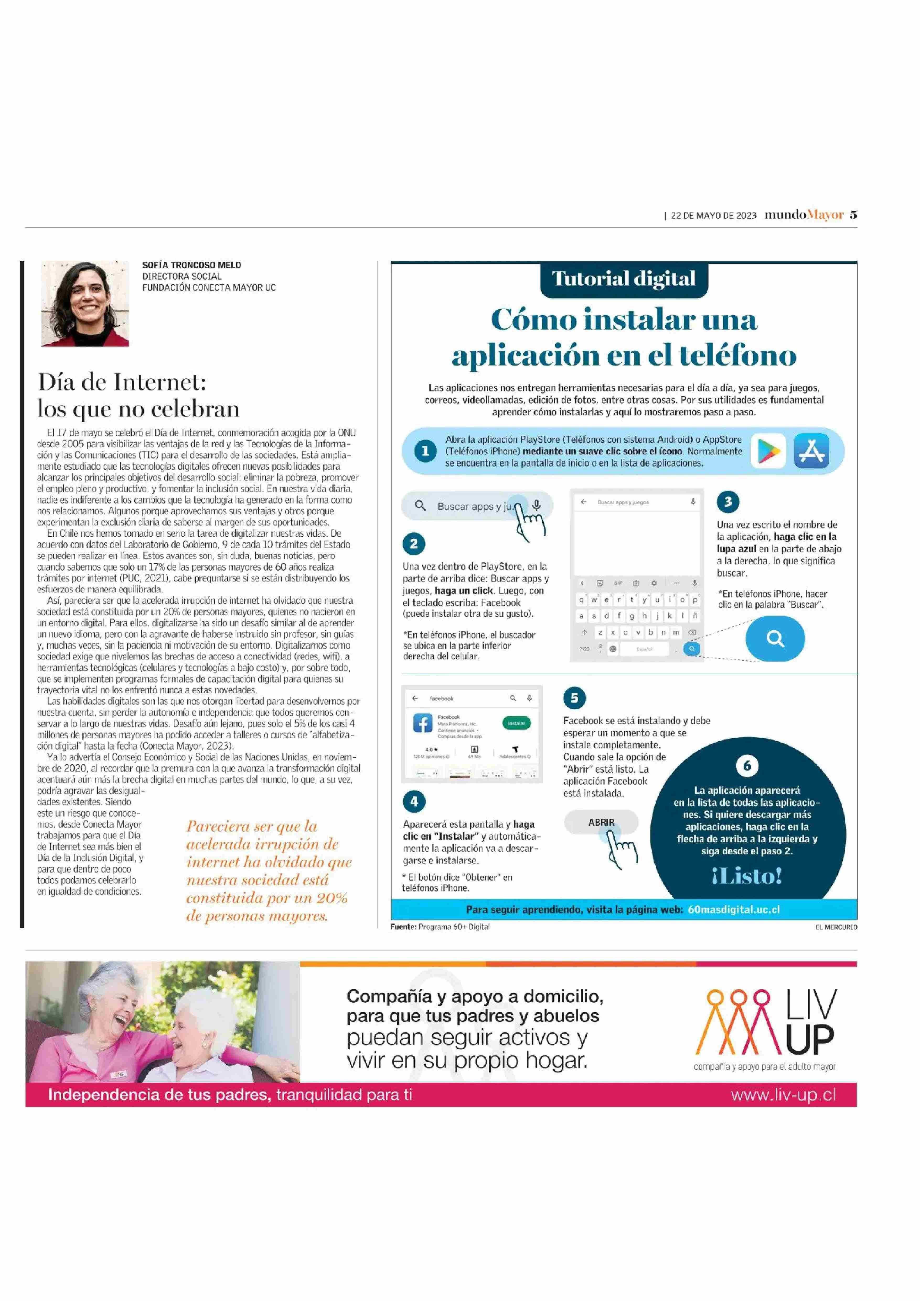 SOFÍA TROFICOSO MELO DIRECTORA SOCiAL FUNDACIÓN CONECTA MAYOR UC 1)ía (le Internet los iue 110 celebran El 17 de mayo se celebró 1 Día de Internet, conmemoración acogida por la ONU desde 2005 para visibilizar las ventajas de la red y las Tecnologías de La Información Información y las Comunicaciones WC) para el desarrollo de las sociedades. Está ampliamente ampliamente estudiado que las tecnologías digitales ofrecen nuevas posibilidades para alcanzar los principales objetivos del desarrollo social: eliminar la pobreza, promover el empleo pleno y productivo, y fomentar la inclusión social.